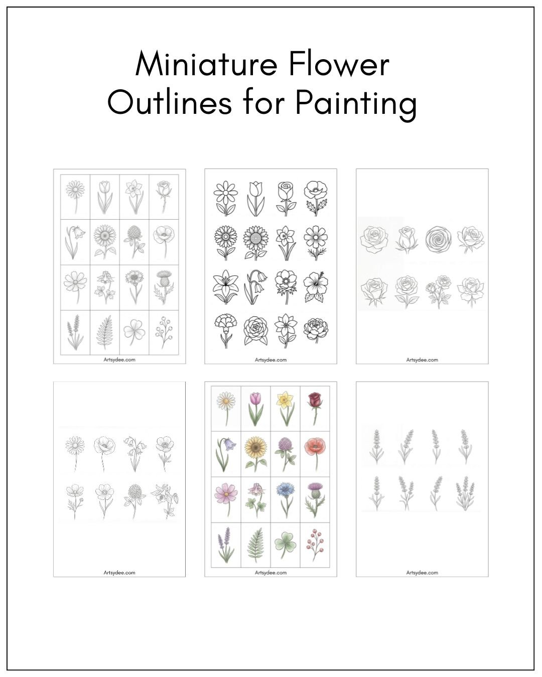 • 12 pages of tiny flower outlines — daisies, roses, tulips, sunflowers, poppies, lavender, cosmos, ferns, clovers and more