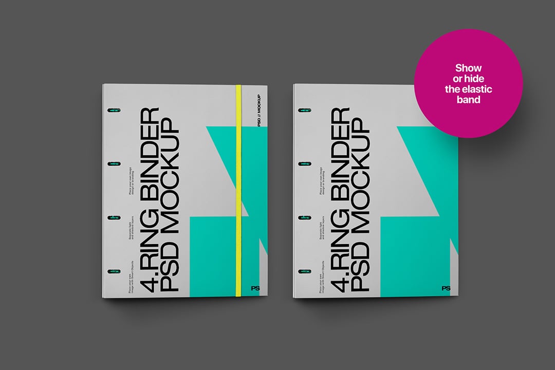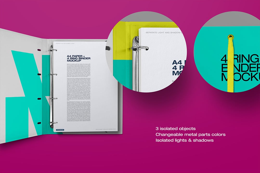 • 3 4-ring binder mockups (front closed, open with A4 paper, back closed)