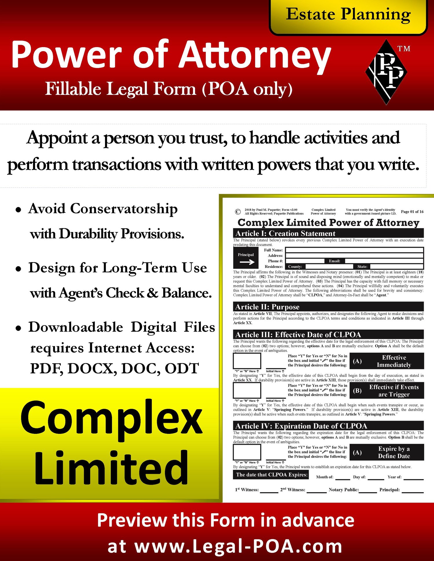 Complex Limited Power of Attorney is a legal document that allows you, the Principal, to appoint a person you trust, the Agent, with limited powers (written by the Principal) and abilities regarding the Principal’s property and affairs.