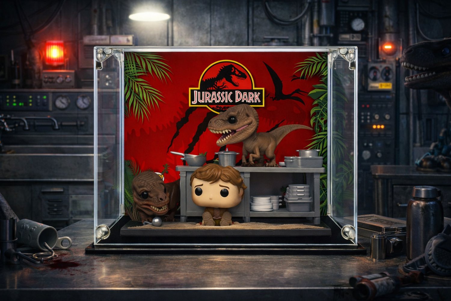 Ce fond a été réalisé pour pouvoir exposer l’ensemble des Pop! Moments Jurassic Park au format 25x20 cm dans une vitrine 25x20x20 cm, avec une présentation cohérente et immersive.