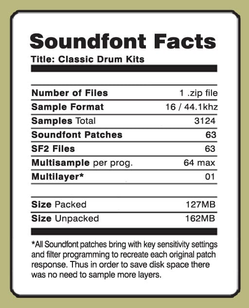 This collection includes a quality set of 63 Drum Kits software or hardware device capable to load Soundfonts. The audio quality is 16-bit / Stereo. The sampled instruments are classic drum machines and several synthesizer drum kits. Many of the kits are General Midi compatible. Note that these are single sample drum and percussion sounds, not actual rhythmic loops.