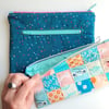 Choose cute patchwork or make a simple plain version. This super pouch comes in two sizes and has a useful extra pocket on the back. Whether you need a makeup bag, a handy project pouch or your kid needs a new pencil case this pattern's got it covered!