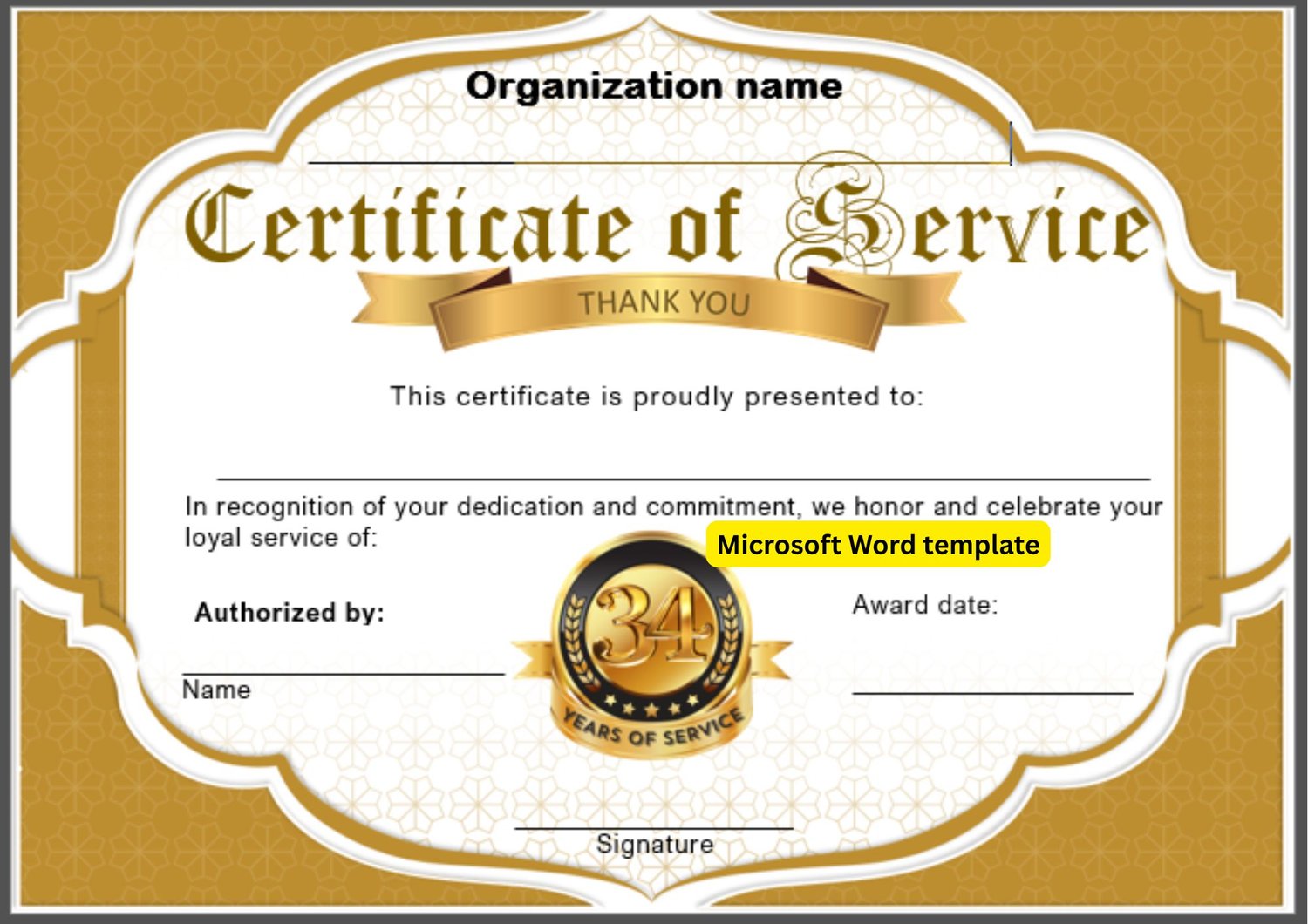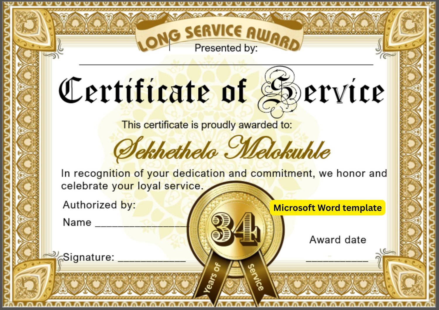 This is a professional landscape certificate template to recognize years of service. Fully editable in Microsoft Word — customize with names, dates, and details