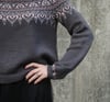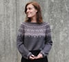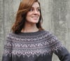 This garment is worked top-down, in the round. After the neckband, short row shaping is incorporated to optimise fit. The majority of the yoke features a stranded colourwork pattern. Only two colours are used in the colourwork pattern per round, with up to four colours used in the colourwork design overall.