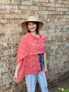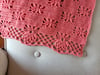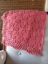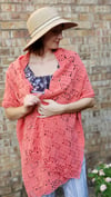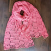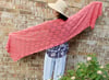 The sample is 18” X 74.5” and is made using Premier Yarns Cotton Fair yarn. Similar soft sport or dk yarns can be used. The piece in dk yarn will come out larger.