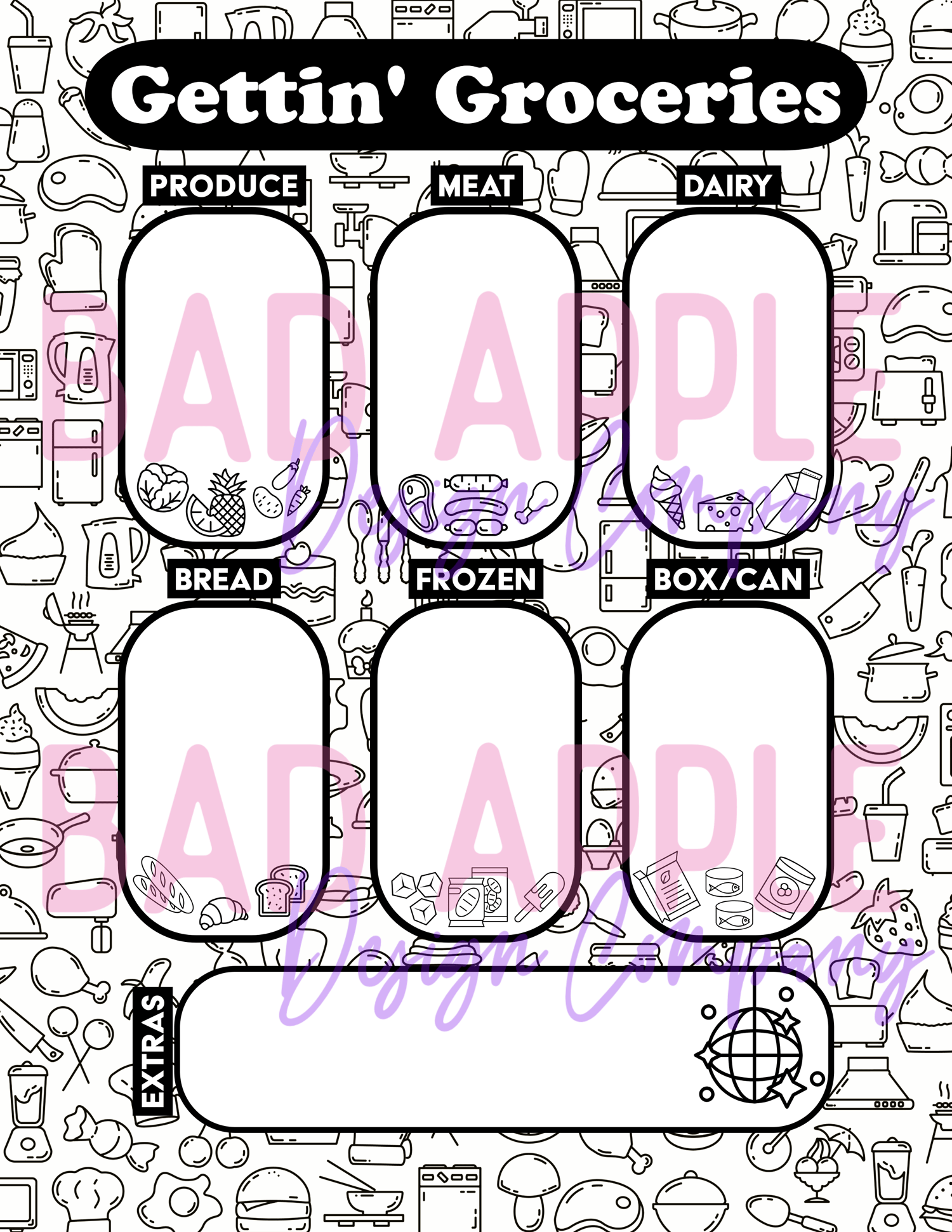 Organized by category (Produce, Meat, Dairy, Bread, Frozen, Box/Can, and Extras), this sheet makes it easy to jot down what you need before you forget it mid-aisle. The black-and-white design is printer-friendly and totally colorable — because even grocery lists deserve a little creative flair.