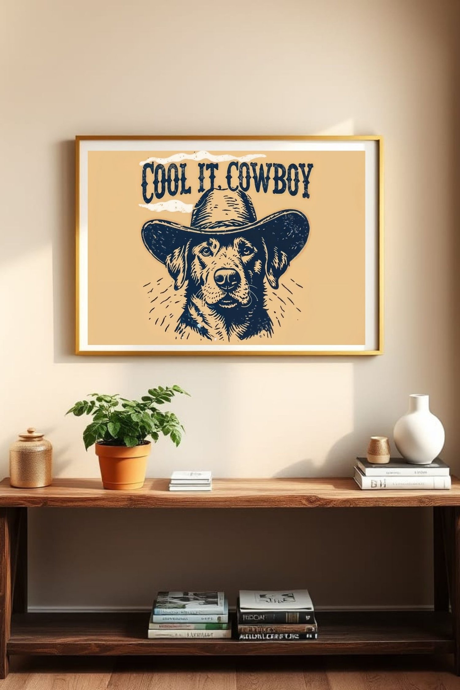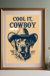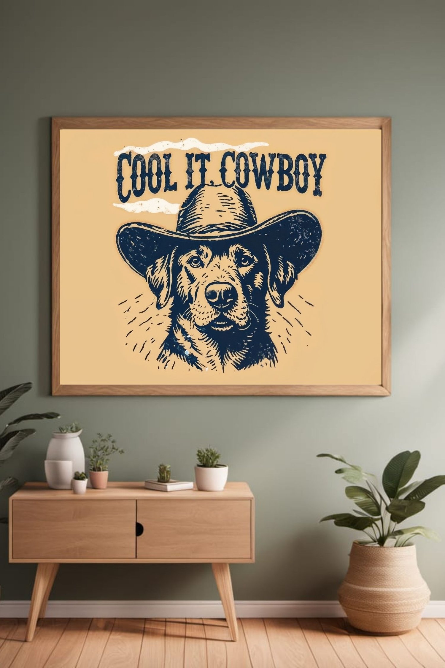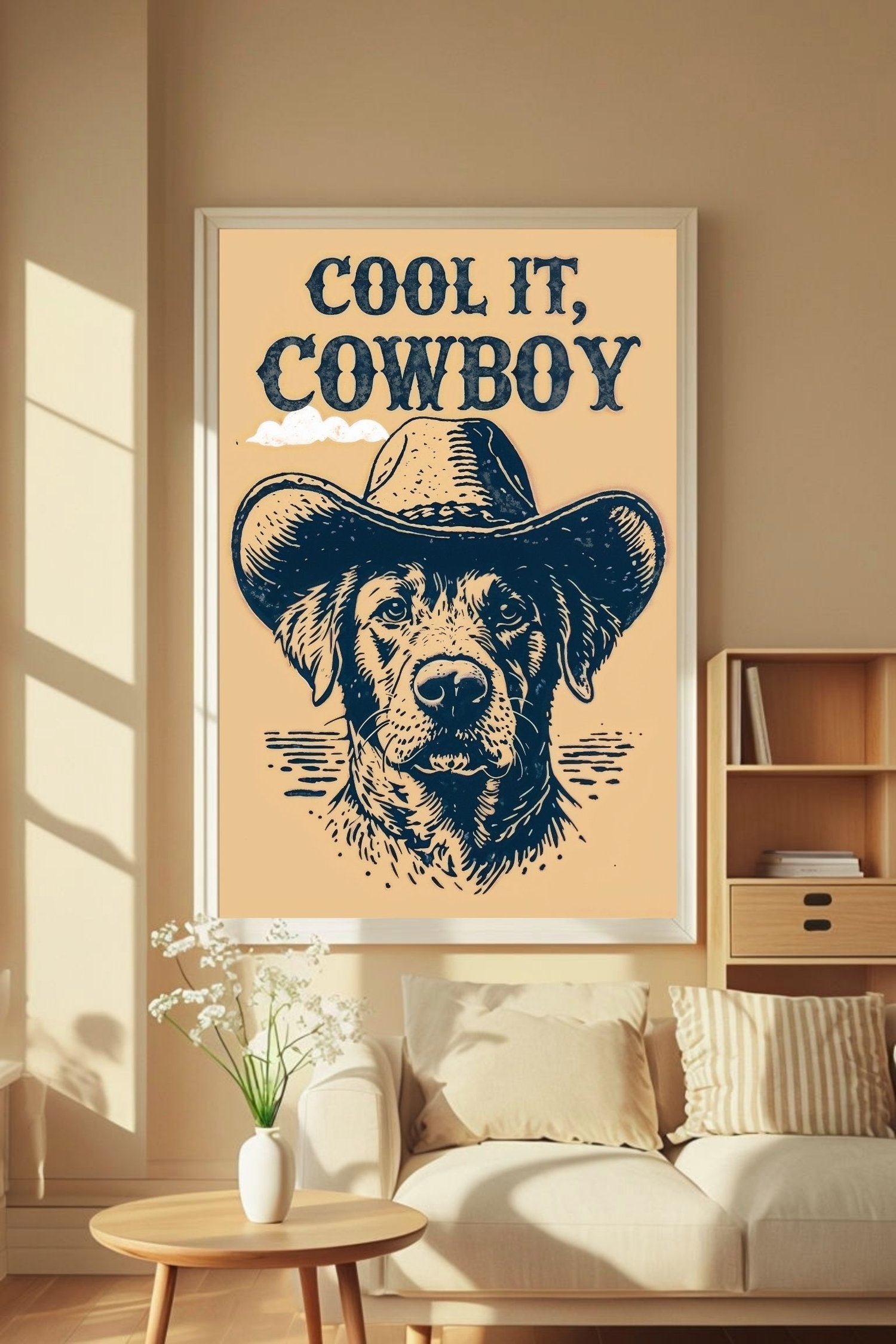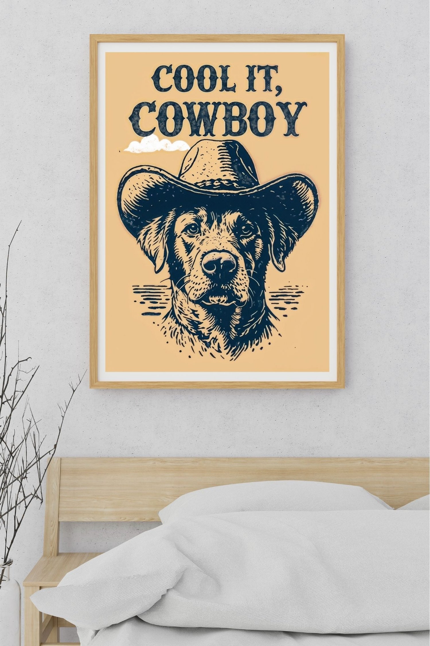 Add a dose of Western charm to your space with this bold and humorous cowboy dog digital art. Featuring a hand-drawn style pup in a classic cowboy hat and the phrase "Cool it, Cowboy", this print is perfect for adding character to any room—whether it's a man cave, office, nursery, or hallway.