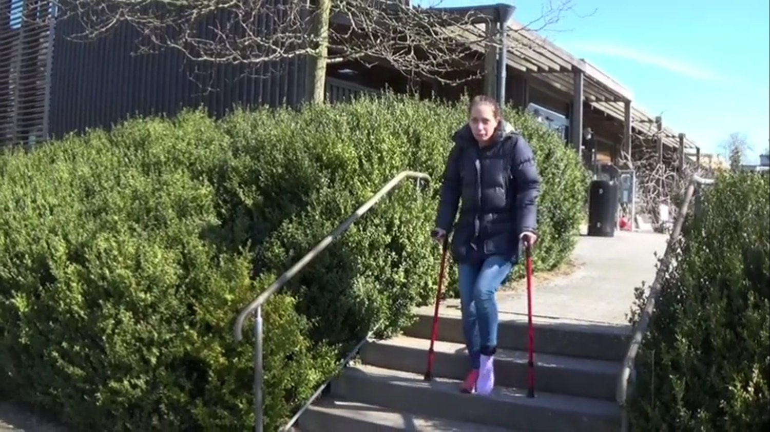 Sunshine crutch with her sleft sprain ankle in a sock and holding her foot in front of her.She crutch down for some steps and we follow her when she crutch to the parking lot.