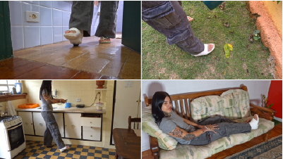 - Close-up cast heel walking, going down stairs, sweeping the yard, watering the plants, putting away the dishes, sitting to watch a serie and talking on the cell phone.