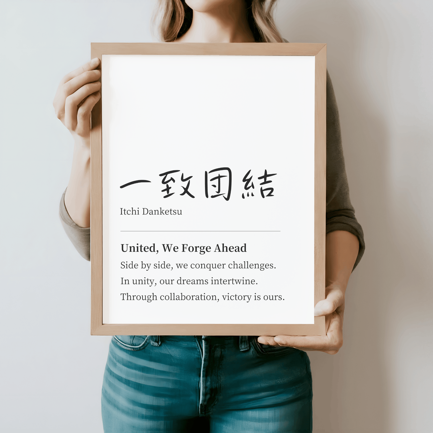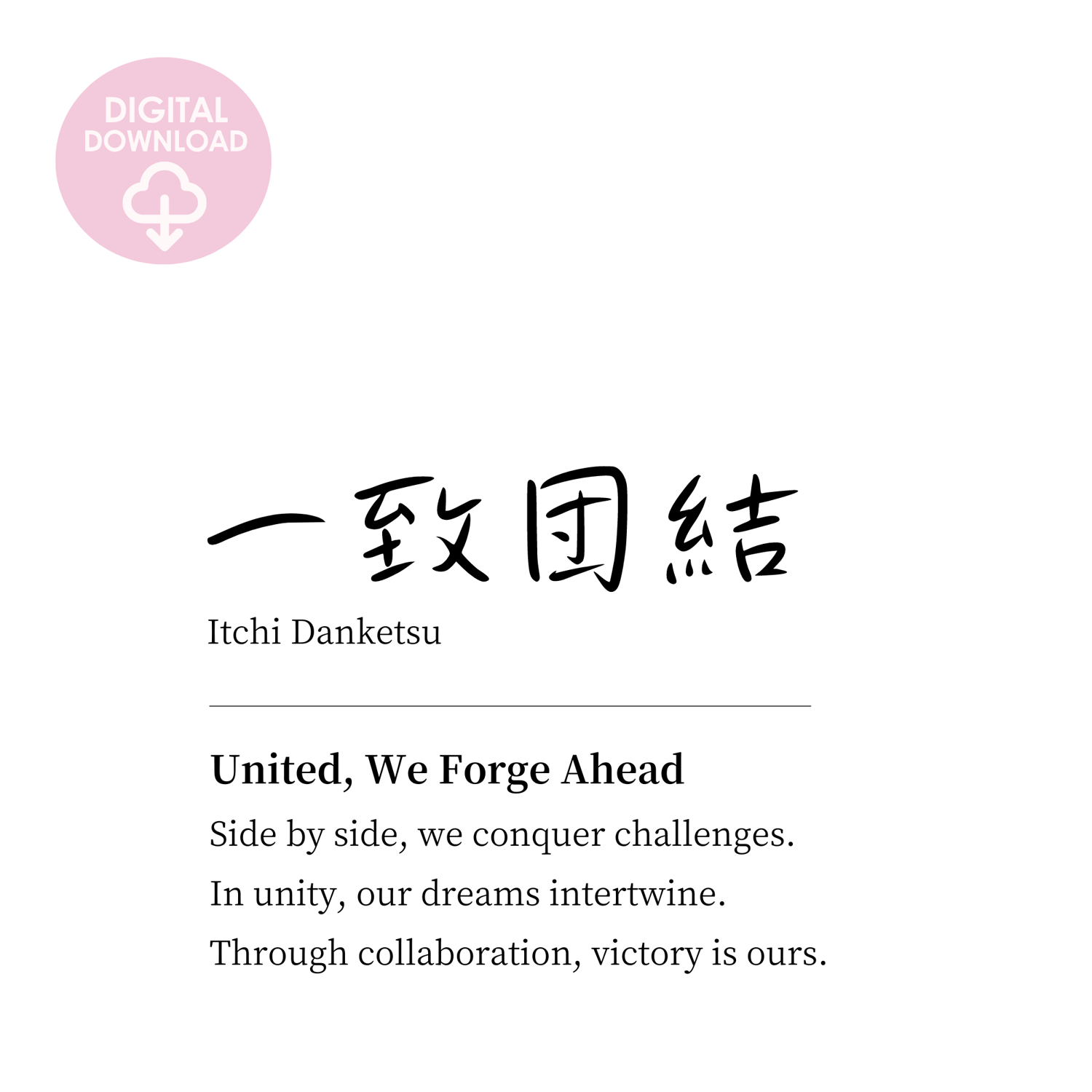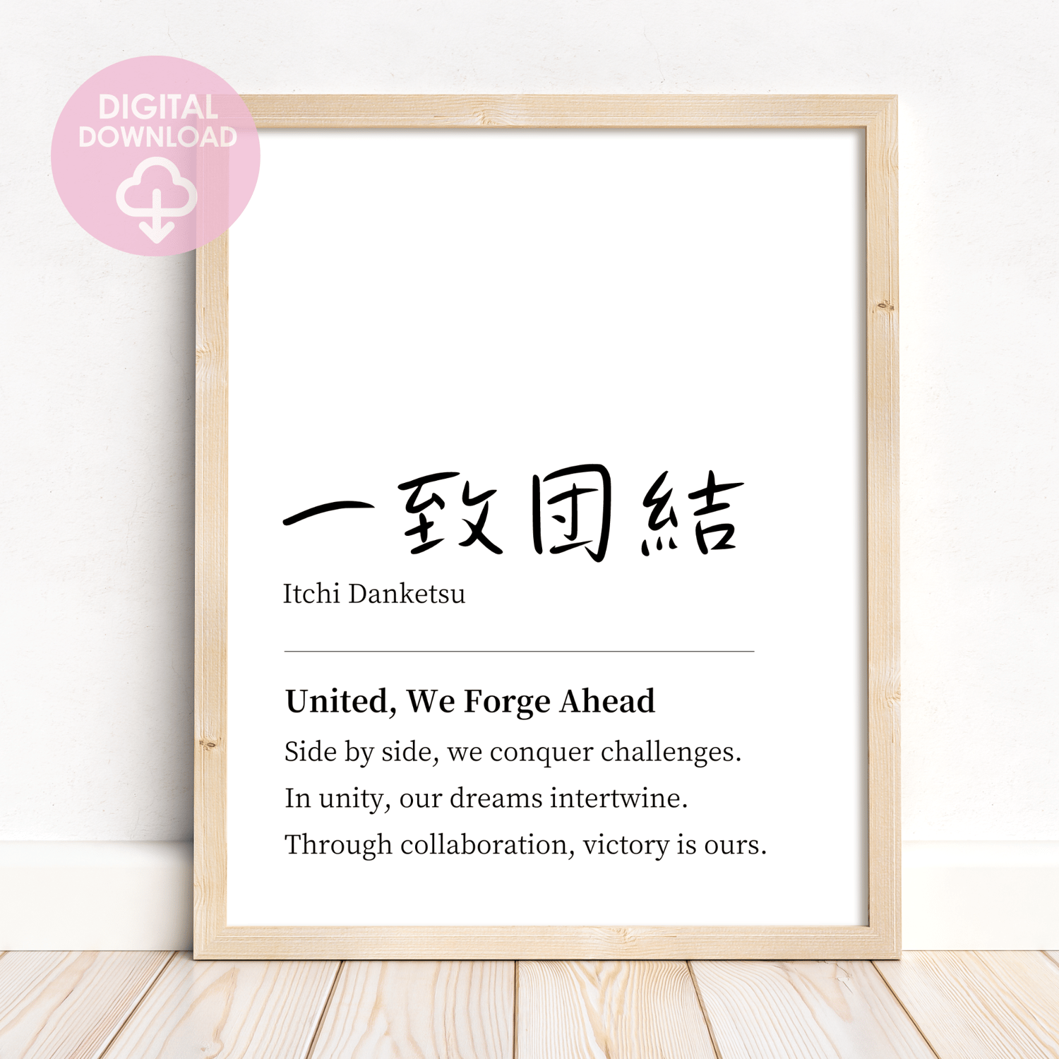 My teamwork quote wall art features the powerful Japanese proverb, ICCHI DANKETSU, meaning 'unite as one towards a common goal.' This minimalist typography art is not just visually striking—it's a daily motivator.