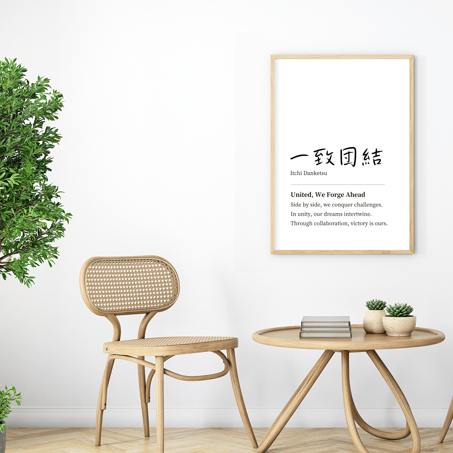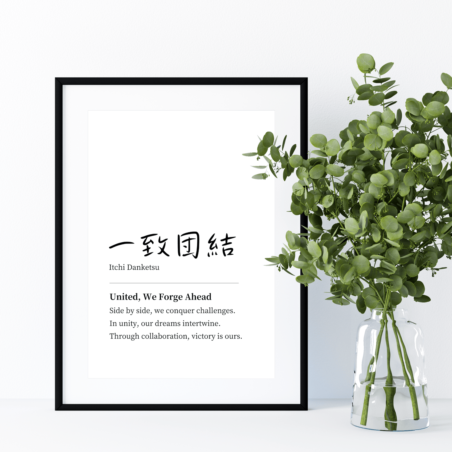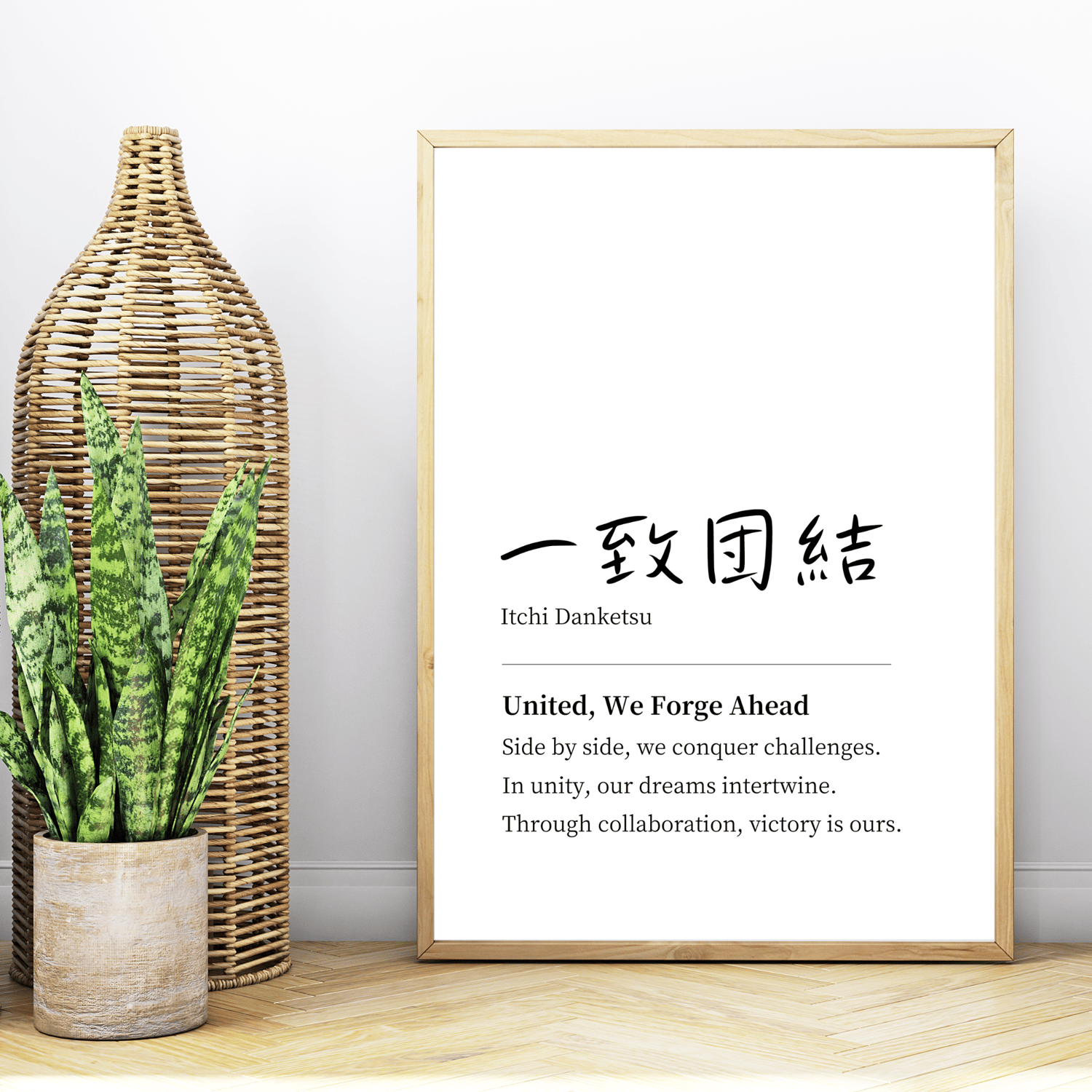 My teamwork quote wall art features the powerful Japanese proverb, ICCHI DANKETSU, meaning 'unite as one towards a common goal.' This minimalist typography art is not just visually striking—it's a daily motivator.