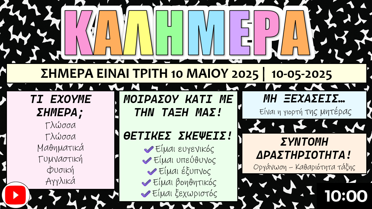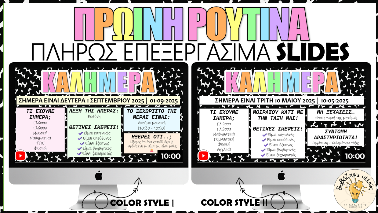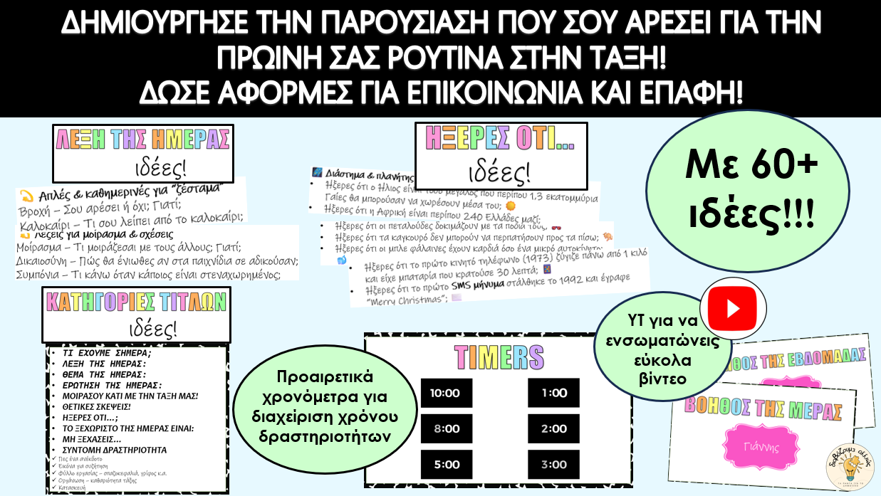 Βαρέθηκες ή θέλεις να ανανεώσεις φέτος την πρωινή συνάντηση με τους μαθητές σου και να την κάνεις το πιο ενδιαφέρον κομμάτι της ημέρας; Αυτά τα πλήρως επεξεργάσιμα Πρωινά Slides είναι το απόλυτο καθημερινό εργαλείο, ώστε οι μαθητές σου να μπαίνουν ομαλά στη μαθησιακή διαδικασία μέσα από διασκεδαστικές και ουσιαστικές δραστηριότητες. Σχεδιασμένα για να δημιουργούν συνέπεια, να καλλιεργούν θετικό κλίμα και να ενθαρρύνουν την επικοινωνία και τη συμμετοχή! Θα γίνουν η αγαπημένη σου ρουτίνα — με ελάχιστη προετοιμασία.