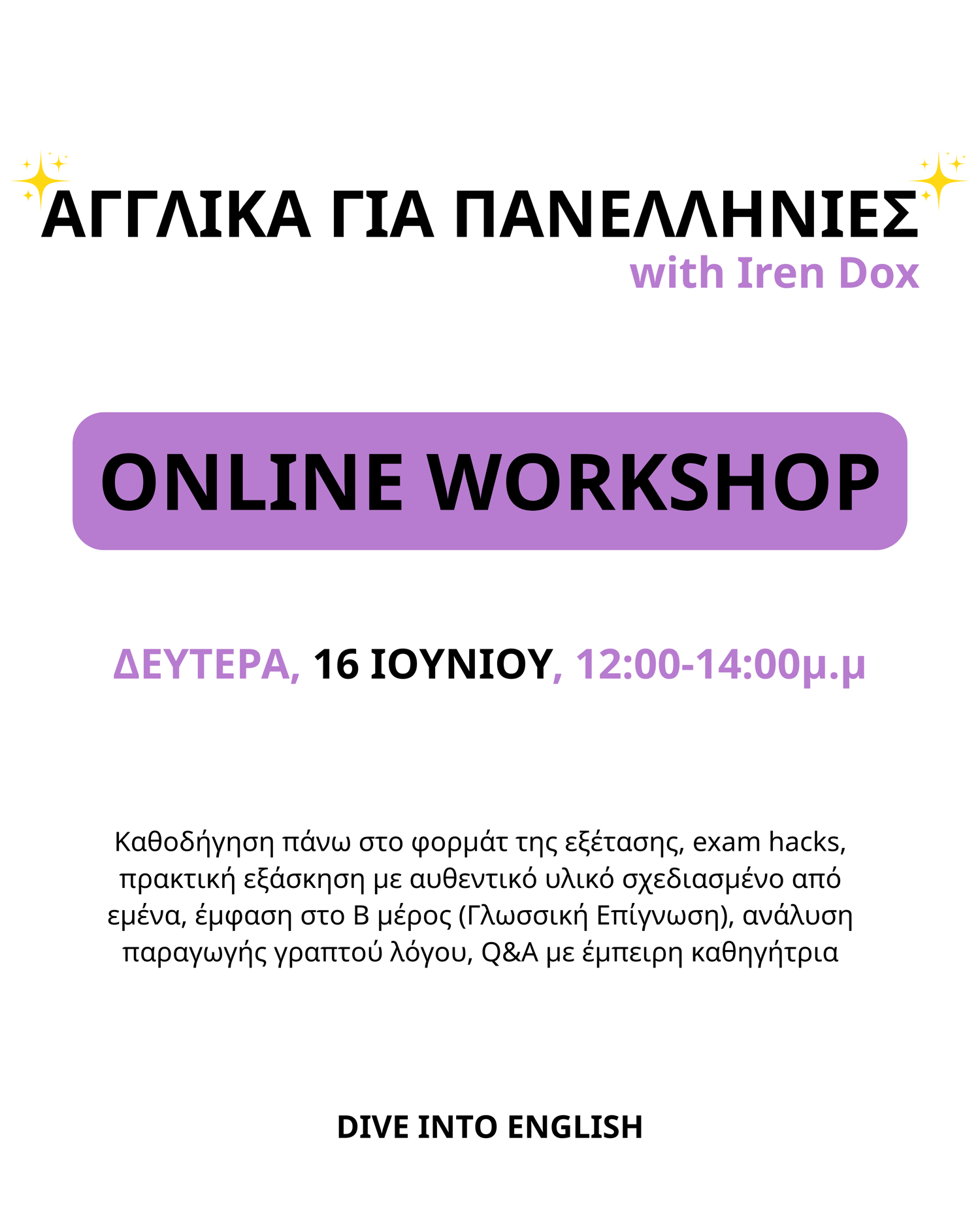 Πάρε μέρος στο δίωρο ONLINE workshop, που σχεδίασα ειδικά για να ενισχύσει τις γνώσεις σου και να σε προετοιμάσει για την επιτυχία στην εξέταση.
