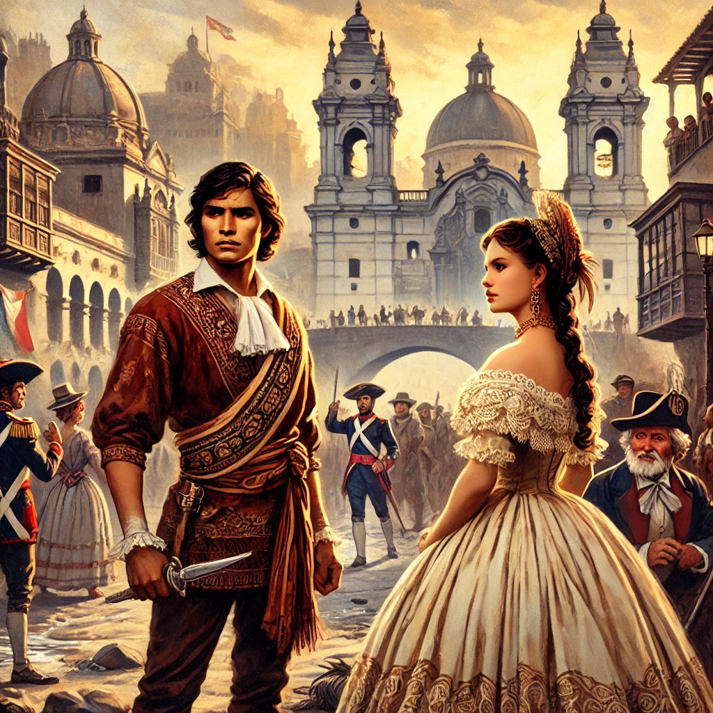 This is a high-resolution digital artwork inspired by Martin Paz, a tale of love, revolution, and cultural conflict set in 19th-century Peru. Against the backdrop of Lima’s colonial streets and political unrest, this visually captivating piece blends drama, romance, and rich historical details. Perfect for lovers of classic literature, historical fiction, and elegant digital art.