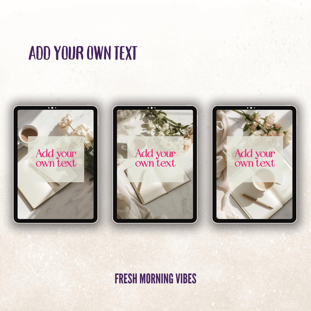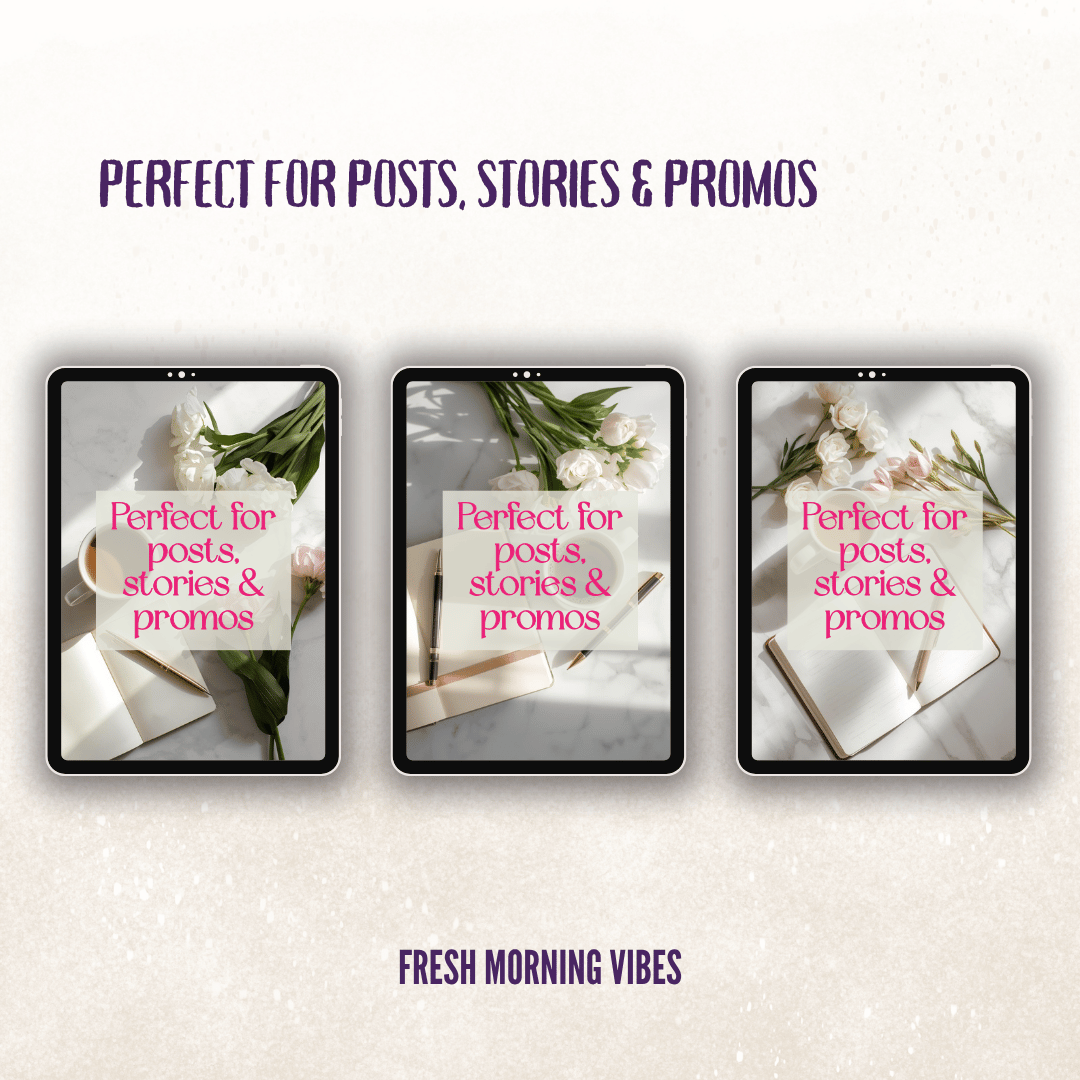 Featuring soft marble surfaces, open journals, warm coffee tones and delicate white and blush florals, these backgrounds capture that calm, intentional morning energy your audience will love.