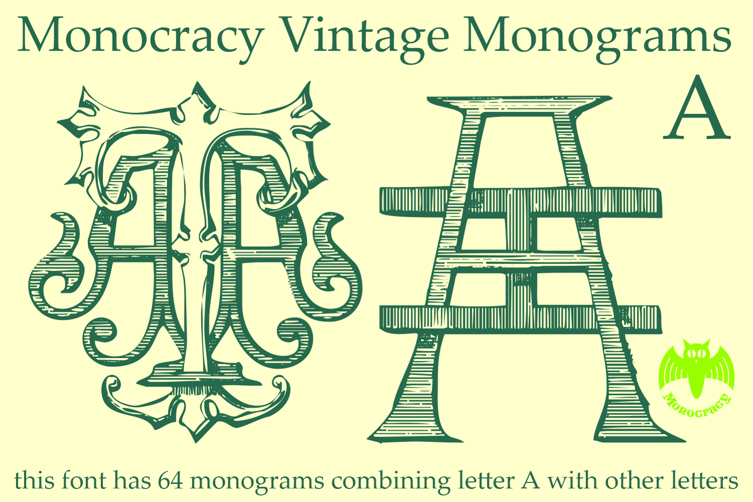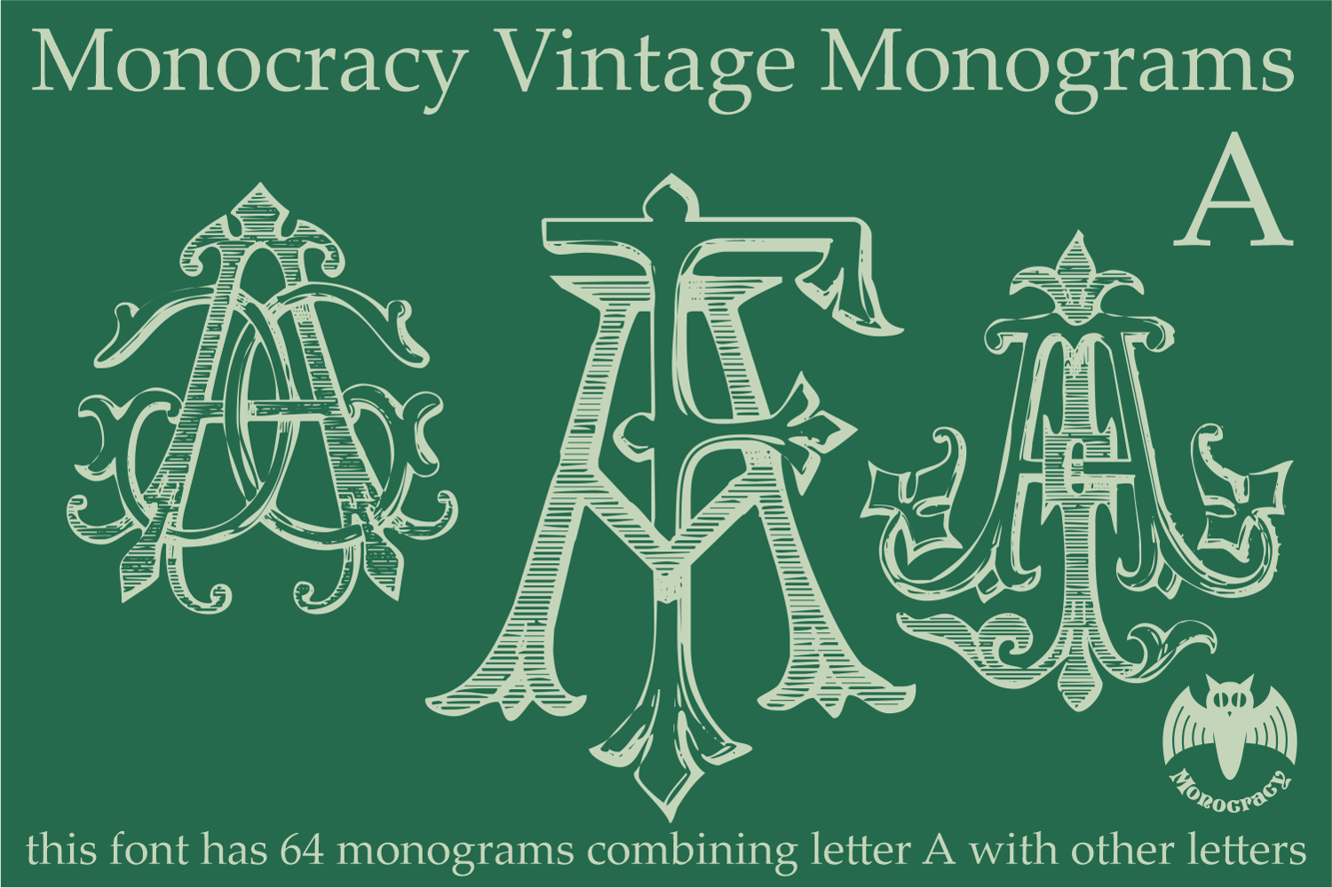 Ready to use font with dozens of monograms combining letter A with other letters... victorian vintage style