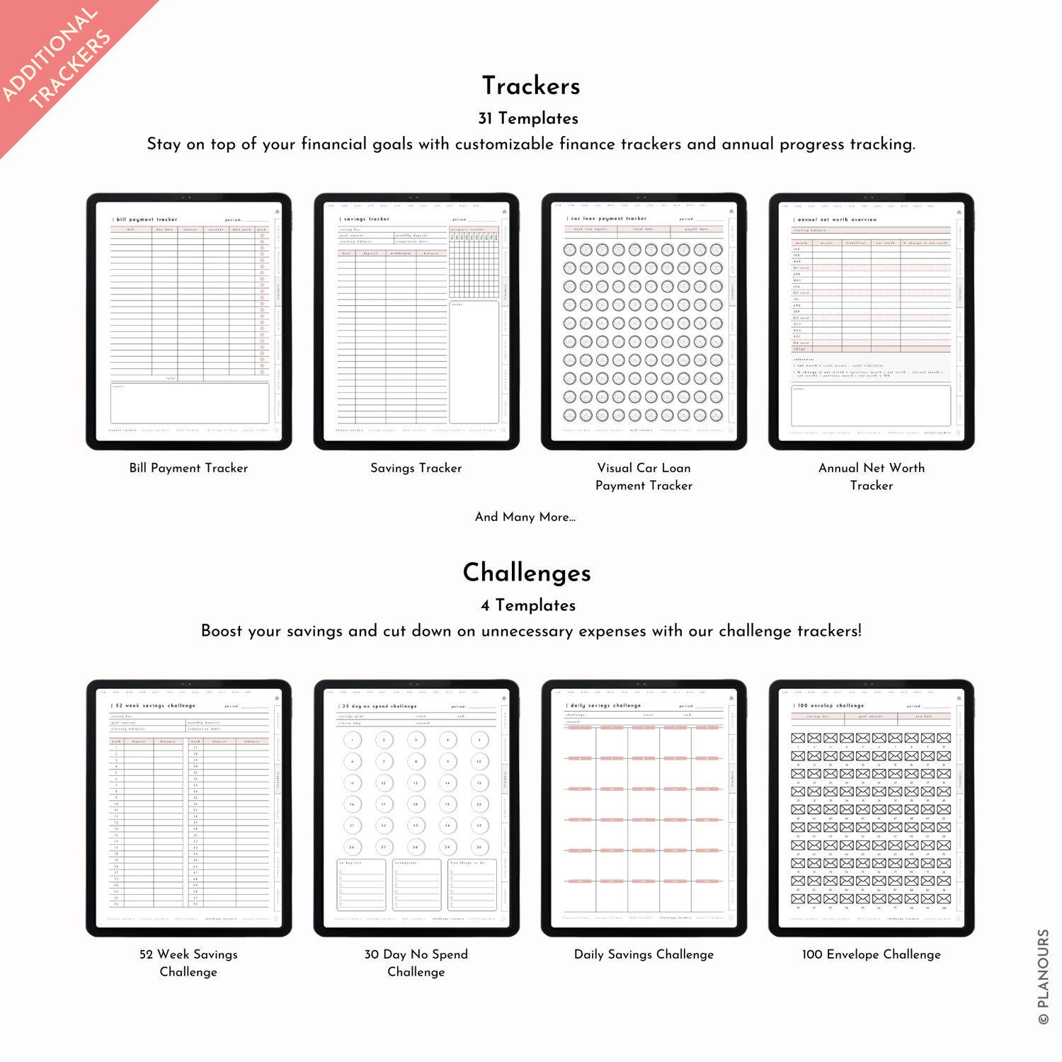 Our Planner features a range of 35 finance trackers and challenges, such as daily savings challenge, annual net worth tracker, credit card payment tracker, savings trackers and debt trackers to help you stay on track and motivated.