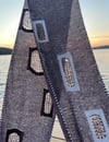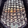 The Skyscraper Scarf features fabric of three thicknesses. After creating each double knit window frame, dropped stitches cascade down to form the diaphanous curtains. The twisted stitches in the window frames enclose the instability of the dropped stitches. I knit this to a grand height of 9 feet to enjoy the glorious drape of the laceweight garter stitch fabric.