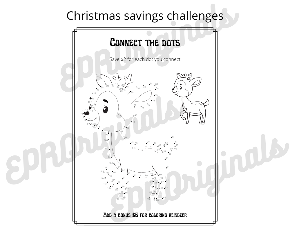riple the fun for adults or kids. Connect the dot savings challenges offer you 2 options on how to save. You can save the same dollar amount for each dot you connect as labeled. If you want a bigger challenge you can also save the dollar amount of the dot number. This is 1 of 3 sets with a Christmas theme.