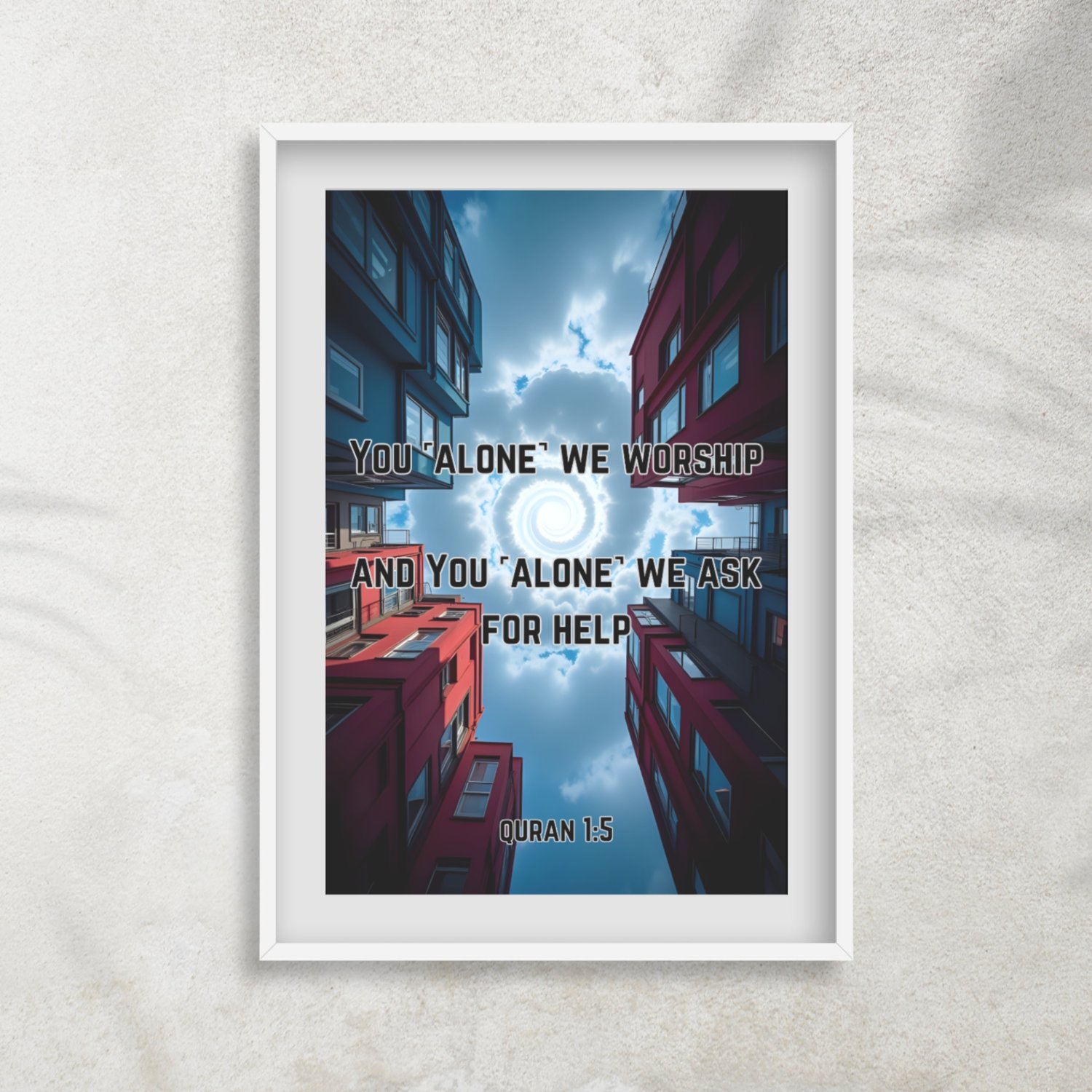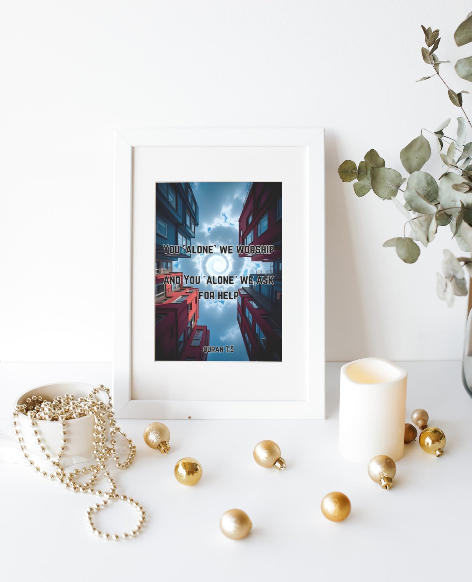 This powerful printable wall art features verse 5 of Surah Al-Fatiha (Quran 1:5): "You alone we worship and You alone we ask for help" (Iyyaka Na'budu wa Iyyaka Nasta'een). The verse is set against a unique urban perspective, looking up between tall buildings towards a swirling sky, creating a modern and thought-provoking interpretation of this fundamental Islamic principle. This printable art is a beautiful reminder of the importance of Tawhid (Oneness of God) and reliance on Him alone. Perfect for adding a touch of Islamic inspiration to your home or office. Simply download, print, and frame. This image was created using AI as a visualization tool.
