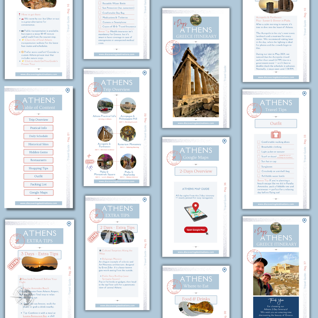 In May 2024, we spent 25 unforgettable days exploring Greece β including 2 full days discovering the best of Athens and a third bonus day near the coast. From iconic landmarks like the Acropolis and charming Plaka to hidden gems shared by locals, this itinerary offers a stress-free way to explore the city with practical tips, curated Google Maps, and food recommendations.