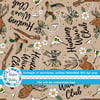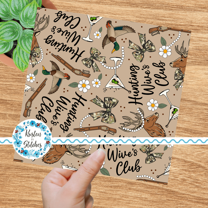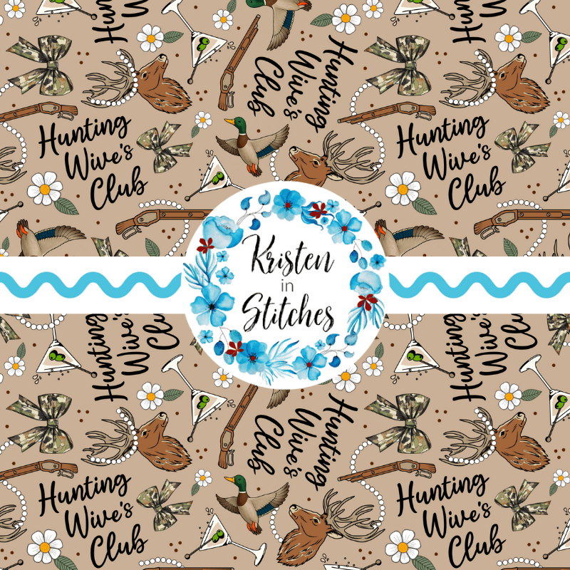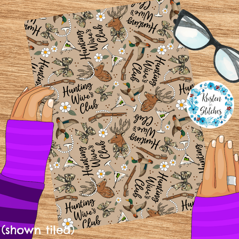 Inspired by the Hunting Wives series, featuring camo bows, deer antlers, ducks, martini glasses, pearls and flowers on tan.
