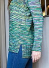 This pullover is worked from the top down, beginning at the back shoulders. The back is worked to the armholes, then placed on hold while the front is picked up from the back shoulders and worked to the armholes. Then the back and front are joined and the body is worked to the bottom edge, with a garter stitch side detail and a hi-low split hem. The sleeves are picked up from the armholes and worked to the cuffs, with short-row shaping to shape the sleeve caps.