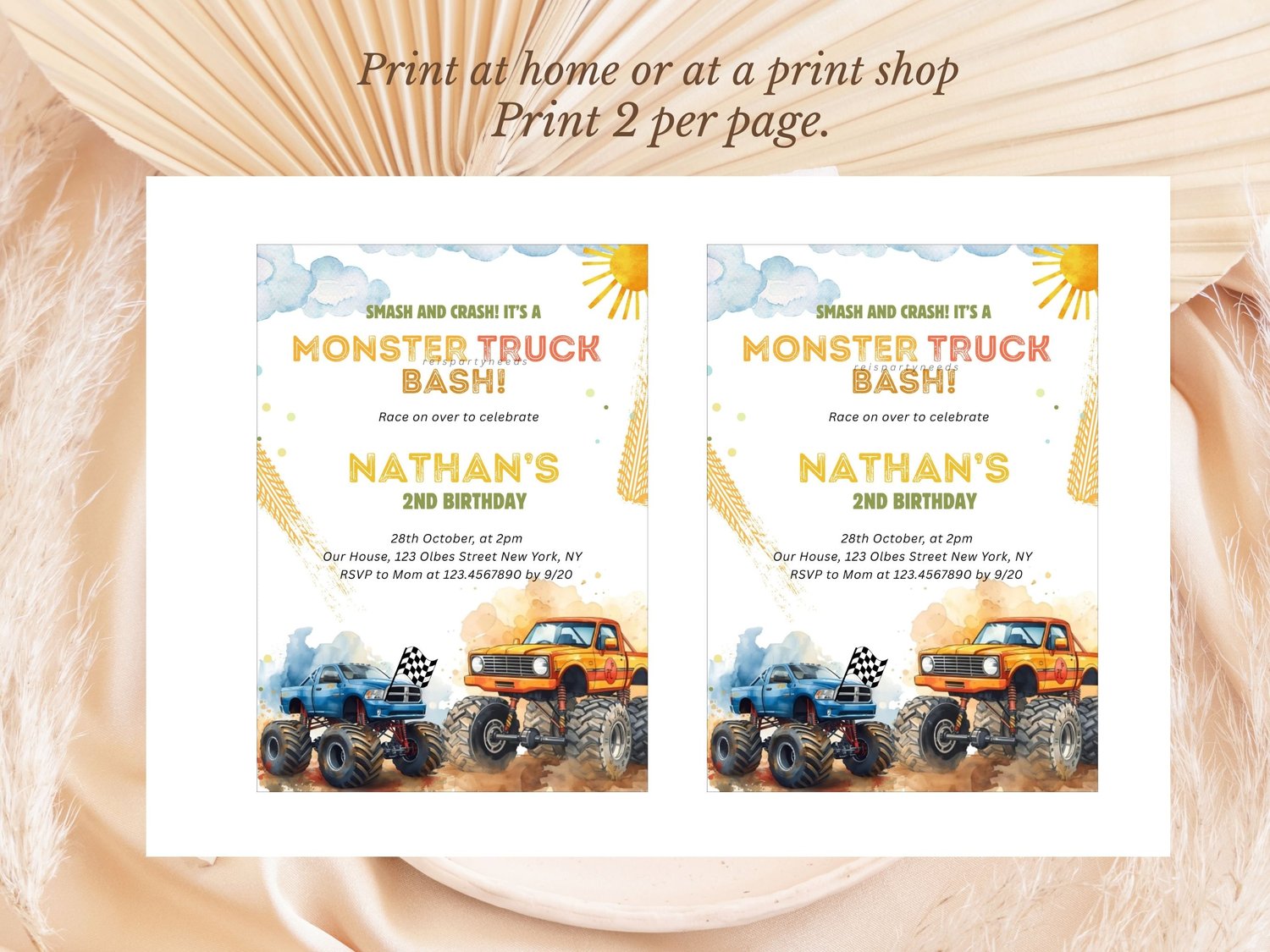 Editable Rustic Monster Truck Birthday Invitation Template, Monster Truck Invitation, Monster Truck Theme, Giant Trucks Invitation Watercolor