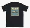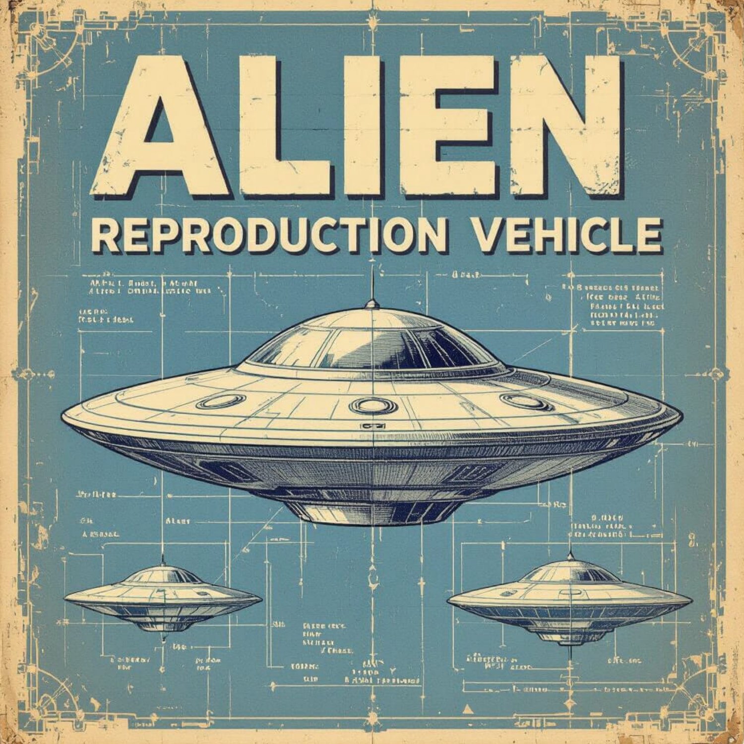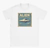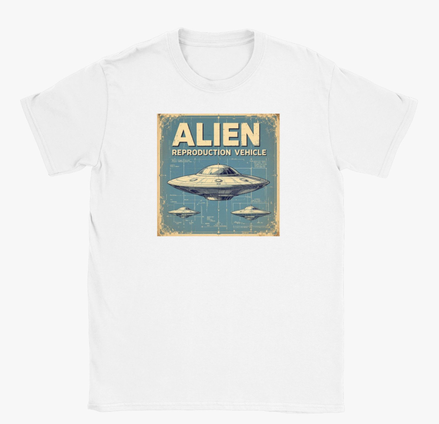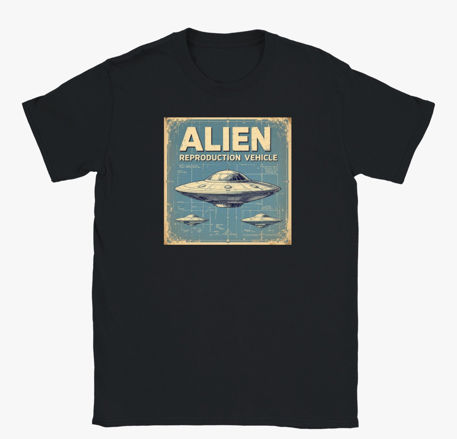 This t-shirt features a bold, retro-inspired design centered around a detailed blueprint of a classic flying saucer. The artwork showcases the “Alien Reproduction Vehicle” in a vintage technical drawing style, complete with labeled schematics and subtle wear effects that give it an aged, sci-fi poster look. With its mix of deep blue tones, cream accents, and distressed edges, the design captures the nostalgic feel of mid-century science fiction and curiosity about extraterrestrial technology—making it a standout piece for UFO enthusiasts and lovers of vintage-style graphics.