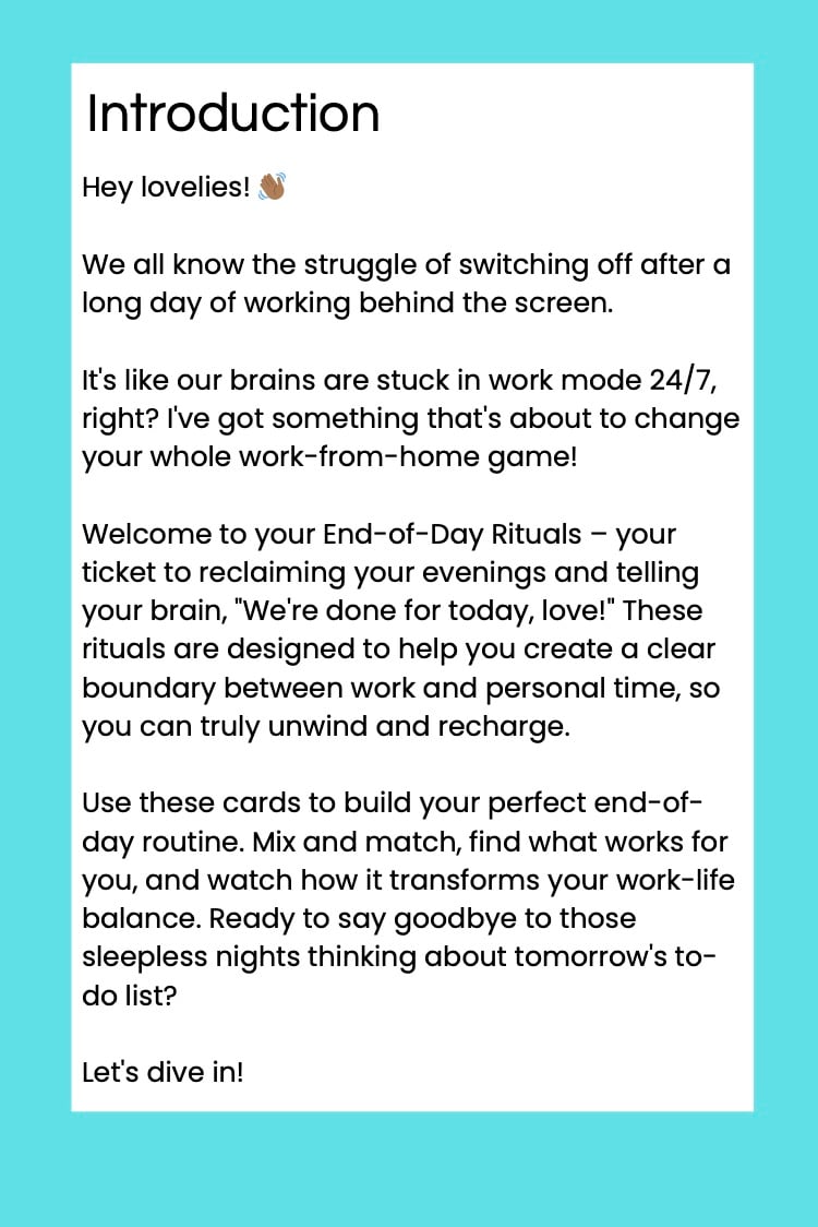 Tired of your workday bleeding into your personal time? Say goodbye to endless screen time and hello to blissful evenings with these end of day ritual cards!
