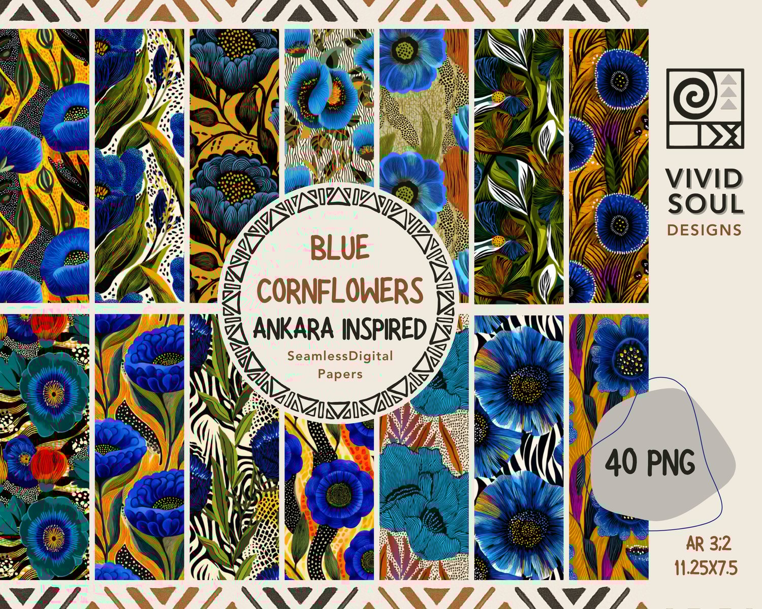 Blue Cornflowers+ Seamless Pattern Bundle (40 PNG Files) – Ankara Inspired Digital Download