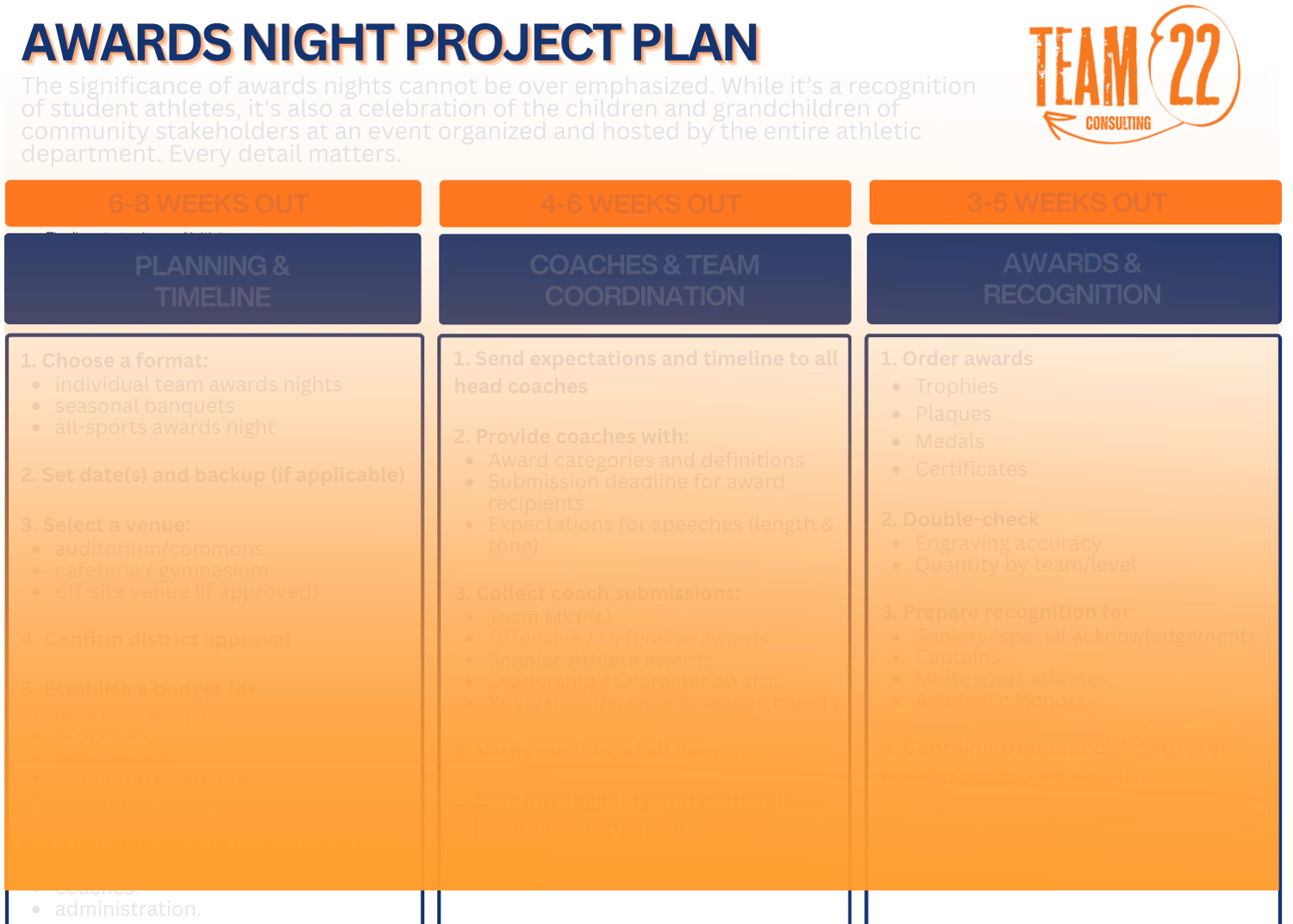 This document is a comprehensive project plan for organizing and executing a successful school athletic Awards Night. Its purpose is to guide athletic departments through a structured, week-by-week timeline that ensures thoughtful planning, clear communication, accurate recognition, and smooth event execution. It emphasizes that awards nights are not just ceremonies, but meaningful community events celebrating student-athletes, families, coaches, and the broader school community—where attention to detail matters at every stage.
