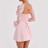 Turn heads in our Blush Lace Romance Dress, designed to make you feel effortlessly beautiful and confident. This pastel pink mini dress features delicate floral lace sleeves and a flattering corset-style bust with tie detail, blending sweet femininity with bold elegance.🤍