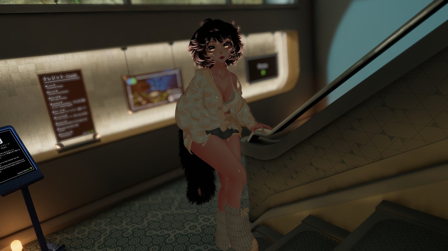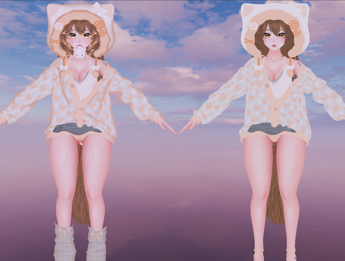head, body, hair and ears, cardigan (not for sale), heels (not for sale), legwarmers, tail, glasses, cat hood, top and skirt, second hair, eye textures. photos by @_jazzie on discord !!
