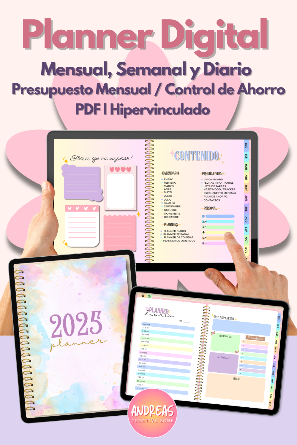 Un archivo PDF - 36 paginas hipervinculadas para que puedas moverte dentro del planner.
