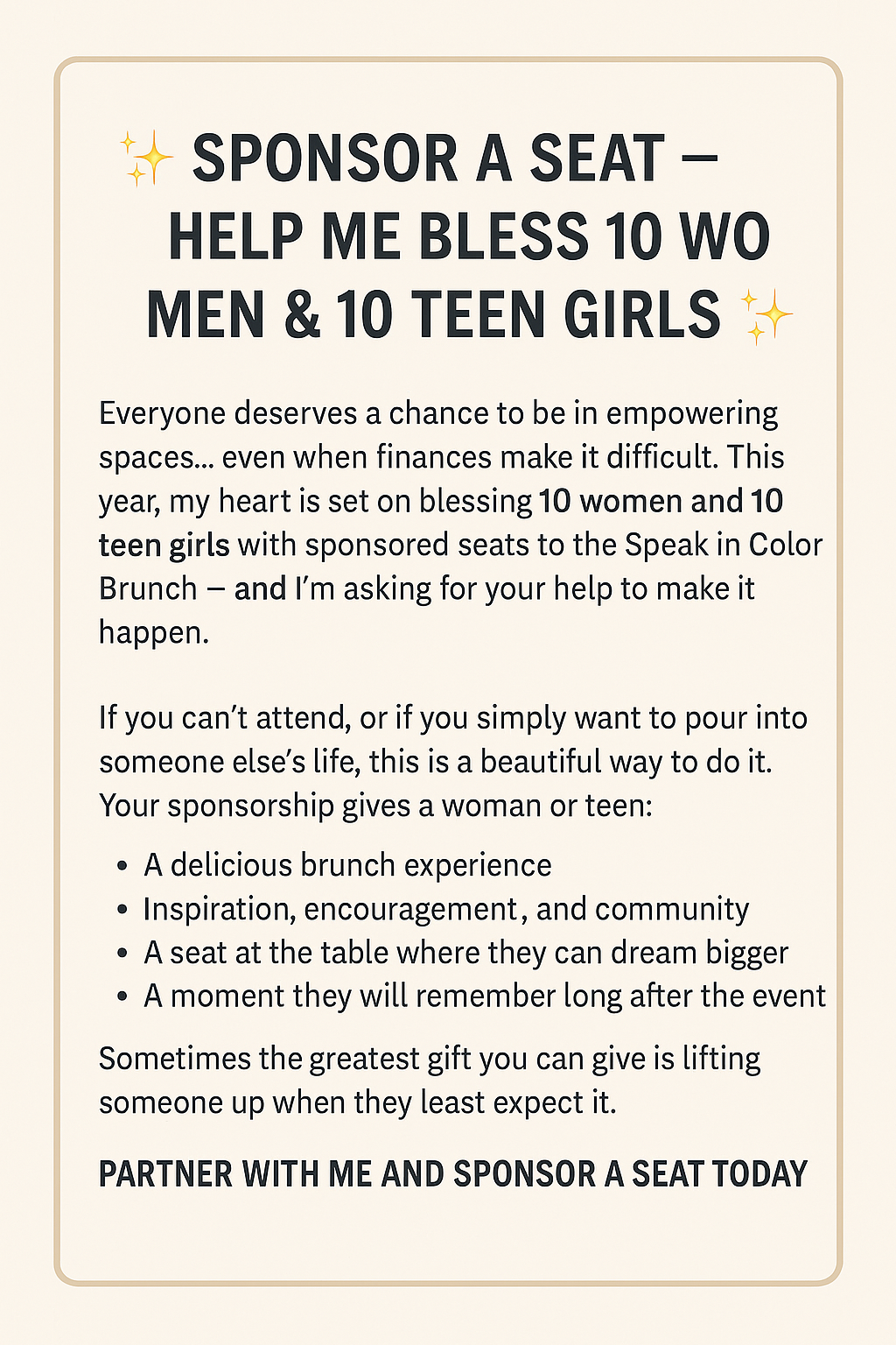Everyone deserves a chance to be in empowering spaces… even when finances make it difficult. This year, my heart is set on blessing 10 women and 10 teen girls with sponsored seats to the Speak in Color Brunch — and I’m asking for your help to make it happen.