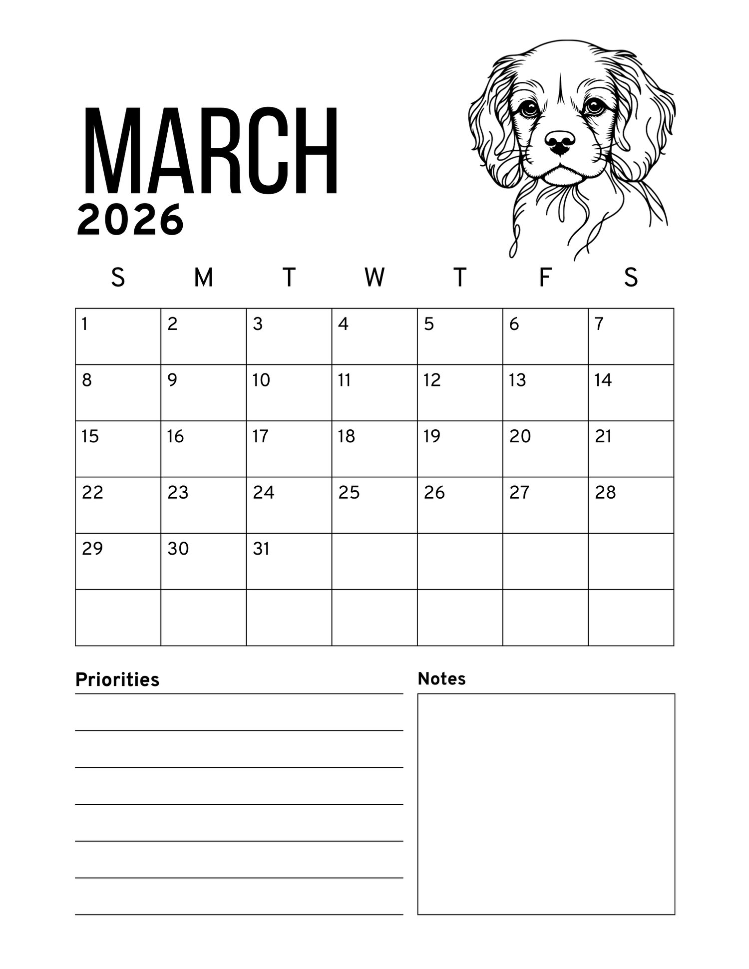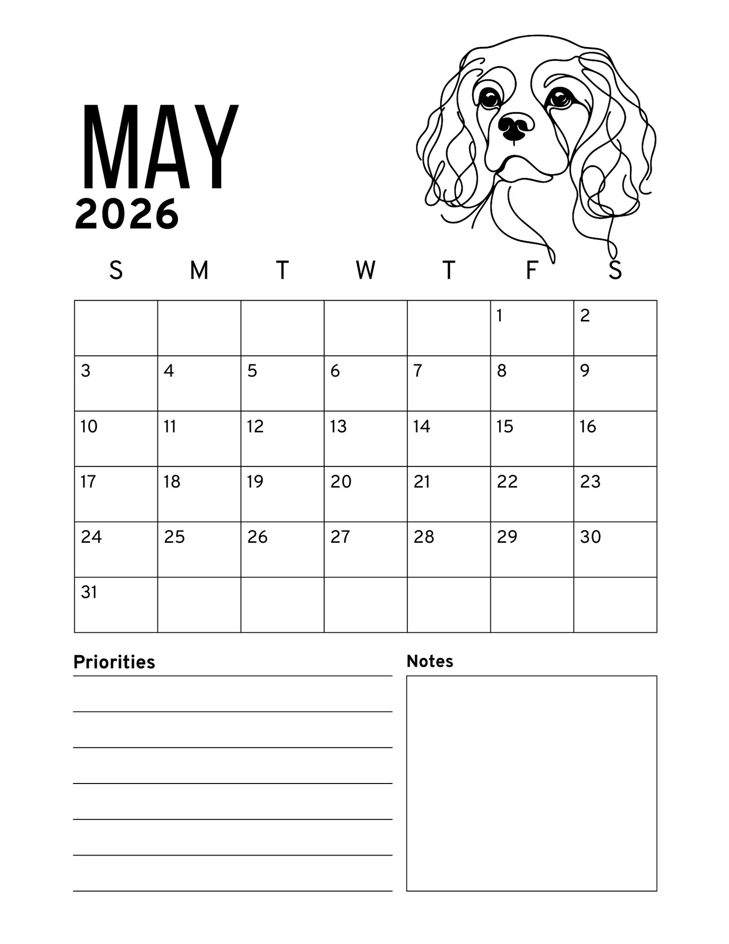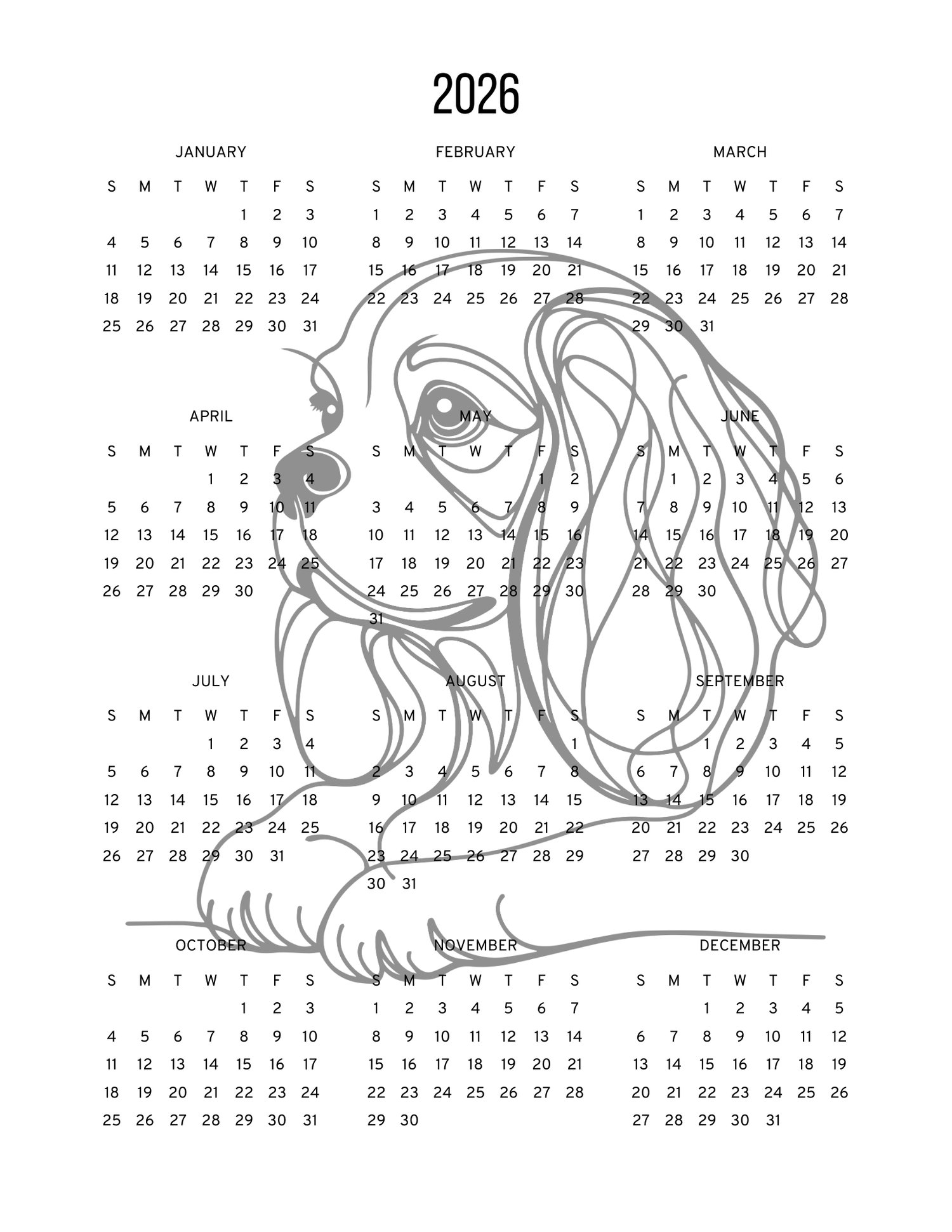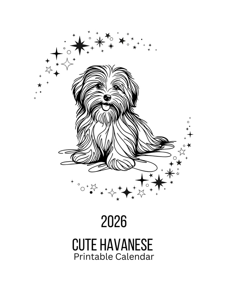 Start the new year with the grace, beauty, and personality of the Cavalier! This 2026 printable calendar brings the beloved Cavalier KCS breed to life month after month. Enjoy stunning Cavalier-themed artwork throughout the year, or gift it to a friend who adores this loyal and elegant breed. Simply download, print, and enjoy a full year of Cavalier joy.