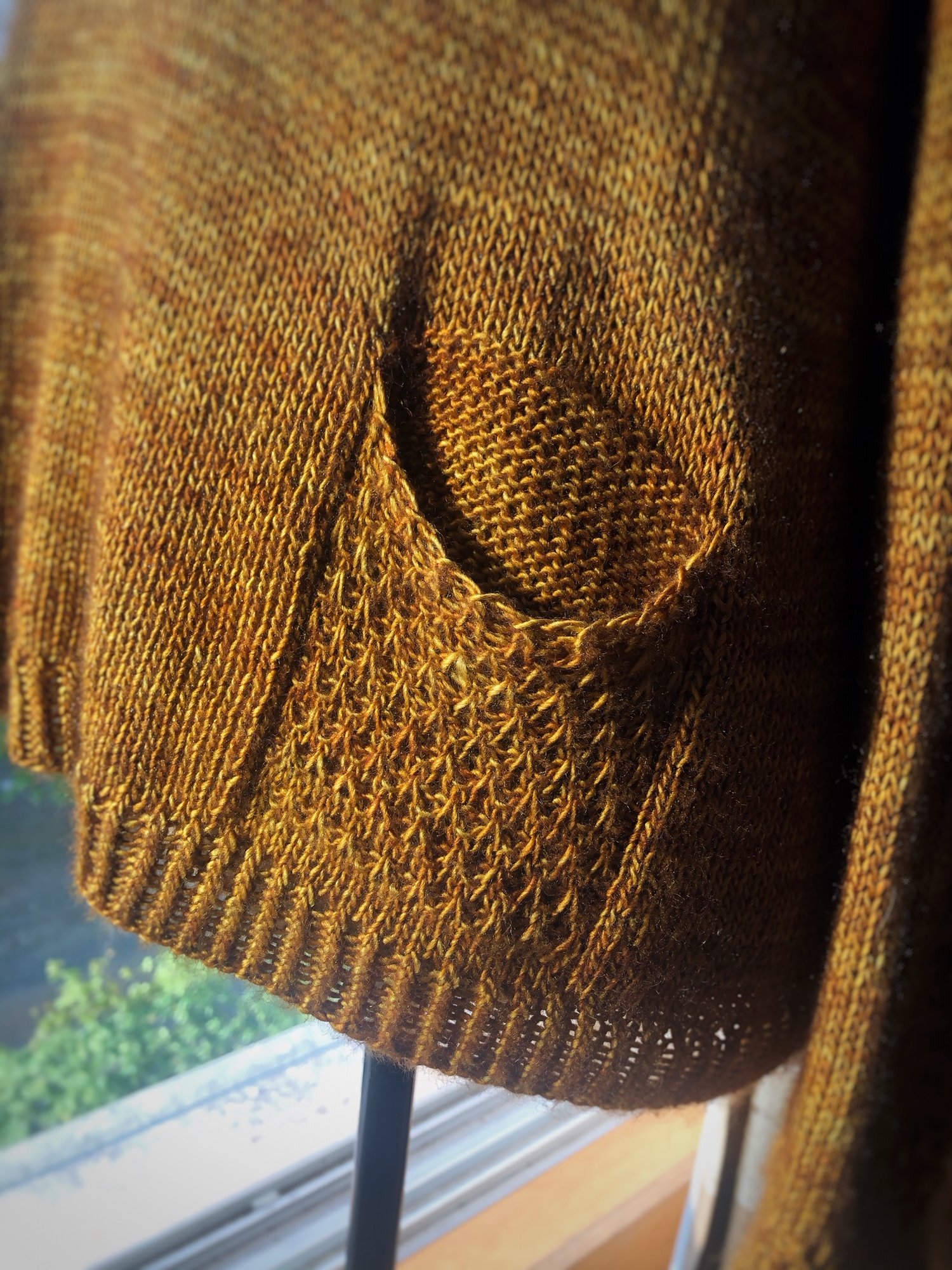 Worked over slip stitch pattern (page 7) using larger needles in the round, after blocking.