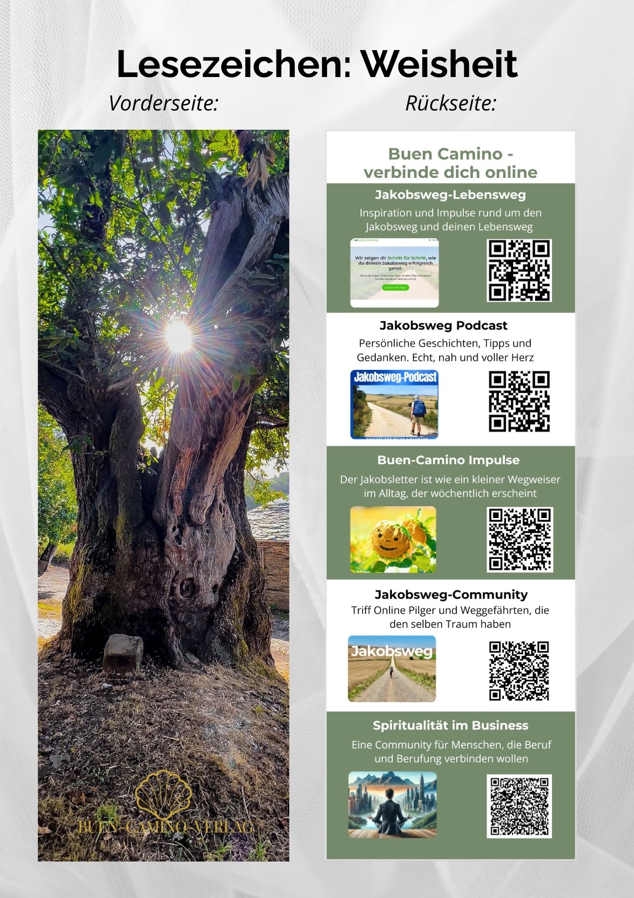 Die Rückseite verbindet dich direkt mit der Buen Camino Welt – mit Podcast, Impulsen, der Jakobsweg-Community und Inspirationen für deinen Lebensweg.
