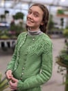 Silvia Got Promoted is worked bottom up, flat. The sleeves are knit in the round, and are joined to the yoke seamlessly. The buttonband is buttoned onto the sweater with linked buttons. The