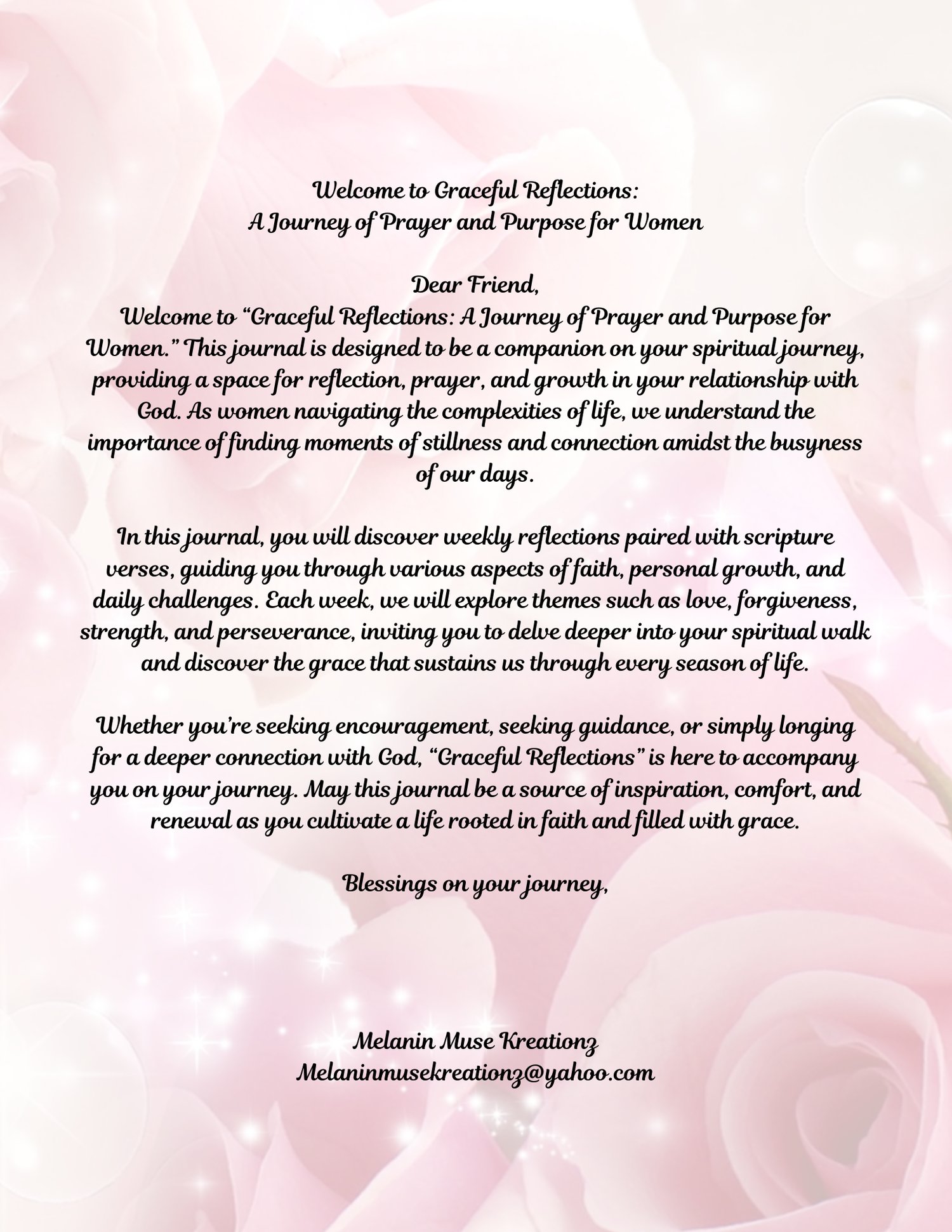 Welcome to “Graceful Reflections: A Journey of Prayer and Purpose for Women.” This journal is designed to be a companion on your spiritual journey, providing a space for reflection, prayer, and growth in your relationship with God. As women navigating the complexities of life, we understand the importance of finding moments of stillness and connection amidst the busyness of our days.