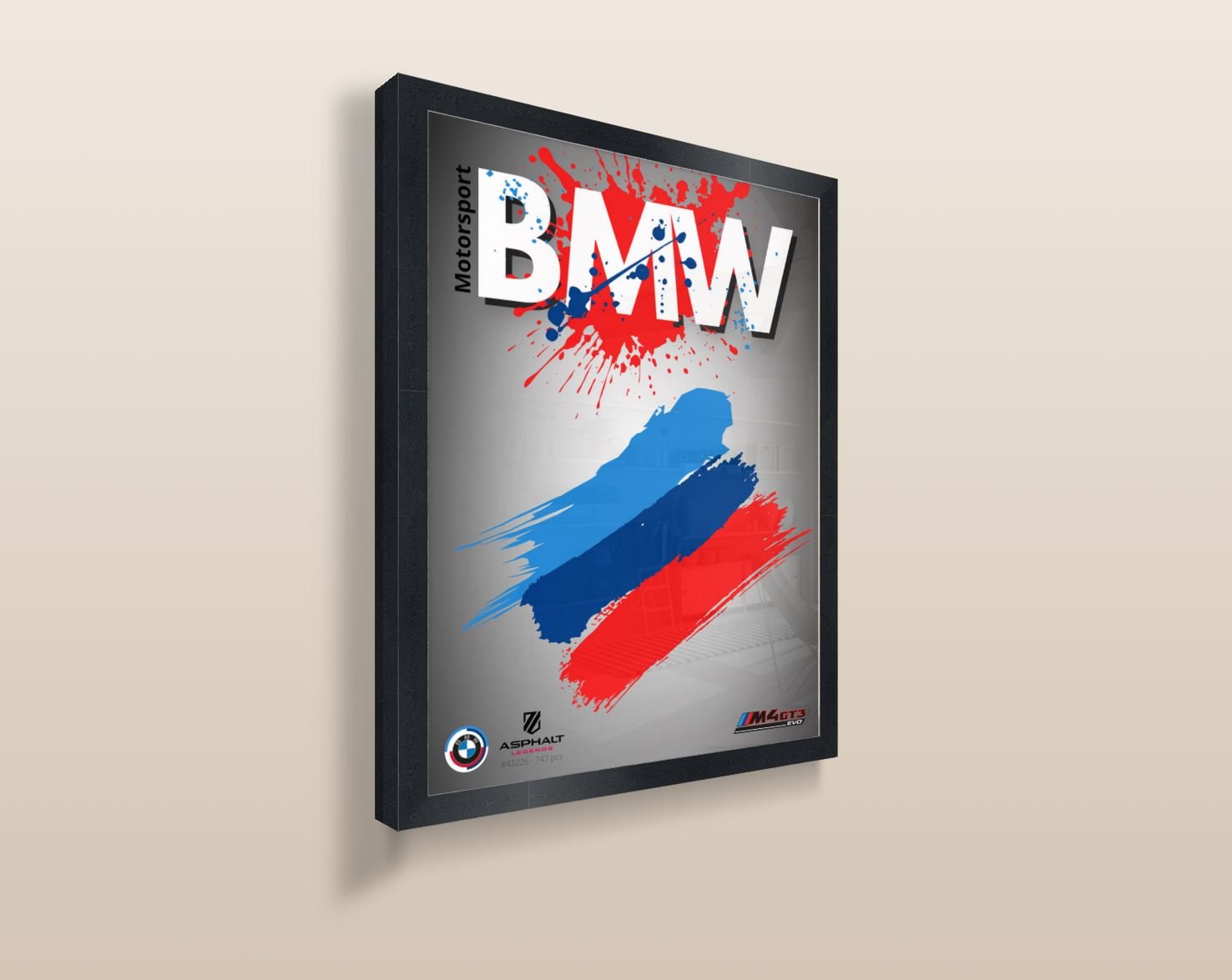 This layout combines the iconic BMW Motorsport colors, paint-splash graphics, and a clean structured composition to create a strong and modern racing presentation.