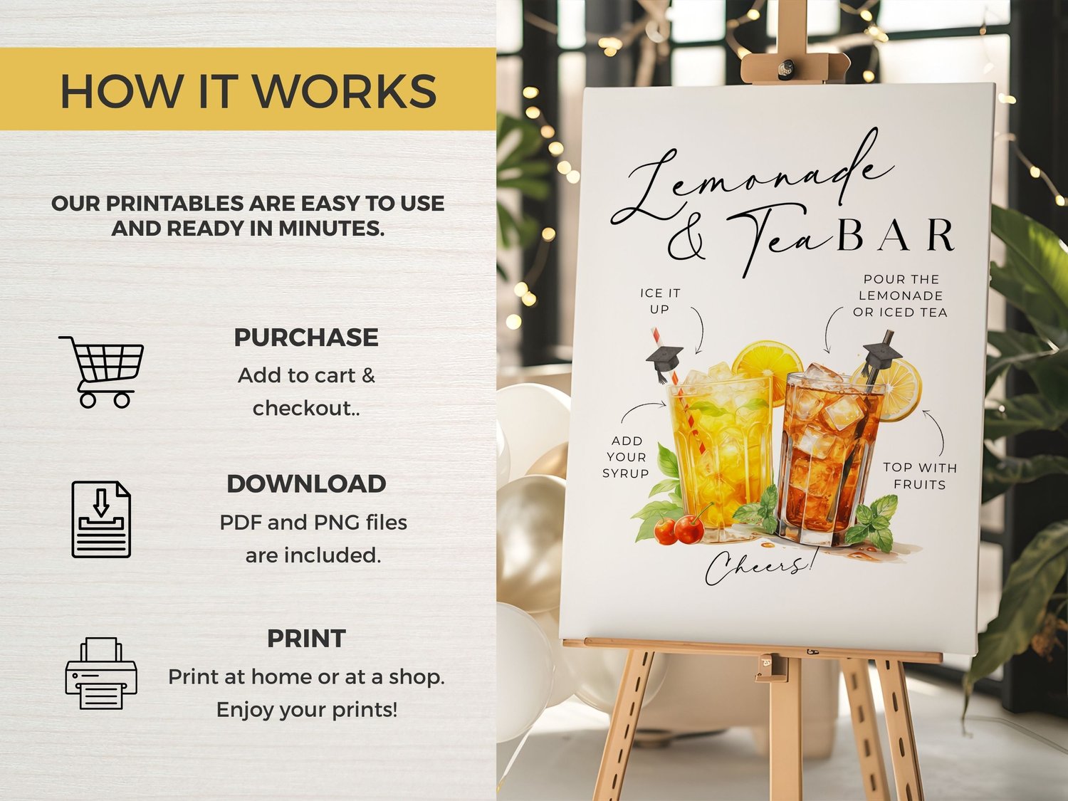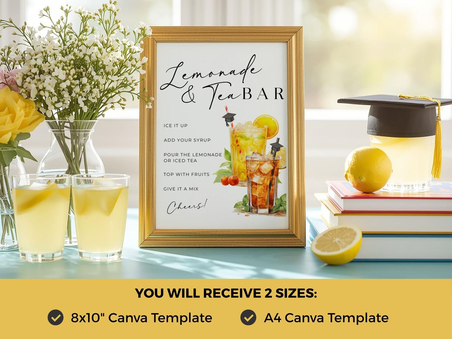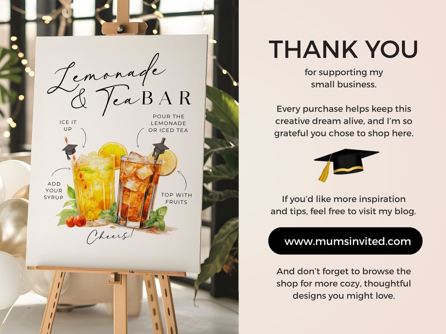Upgrade your graduation party with this elegant Lemonade & Tea Bar sign β perfect for guiding guests through your drink station while adding a clean, stylish touch to your setup.
