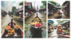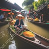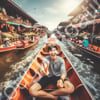 A joyful long-tail boat ride through Floating Market Damnoen Saduak, captured with a wide-angle lens to encompass Thai culture.