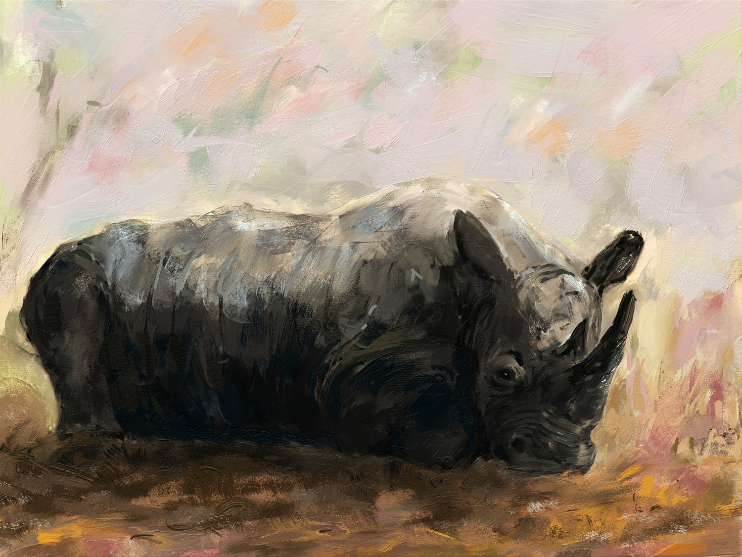 Rhino Resting – Celebrate the beauty of wildlife with this hand‑painted digital rhino artwork, created in a rich oil paint style to bring character and warmth into your space.