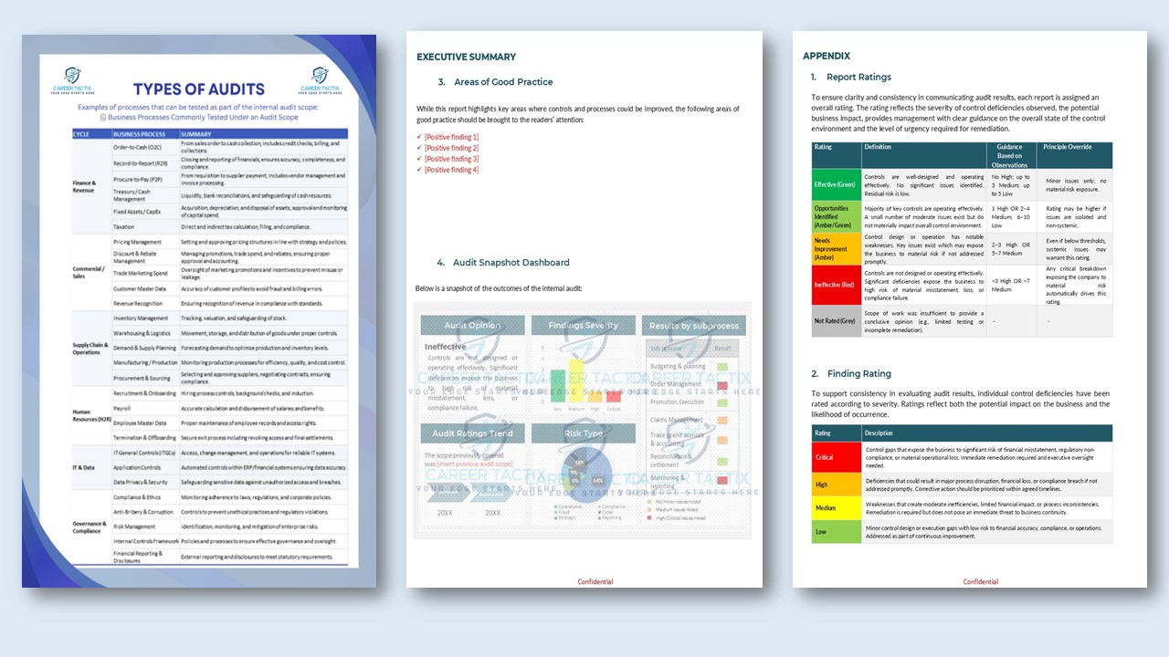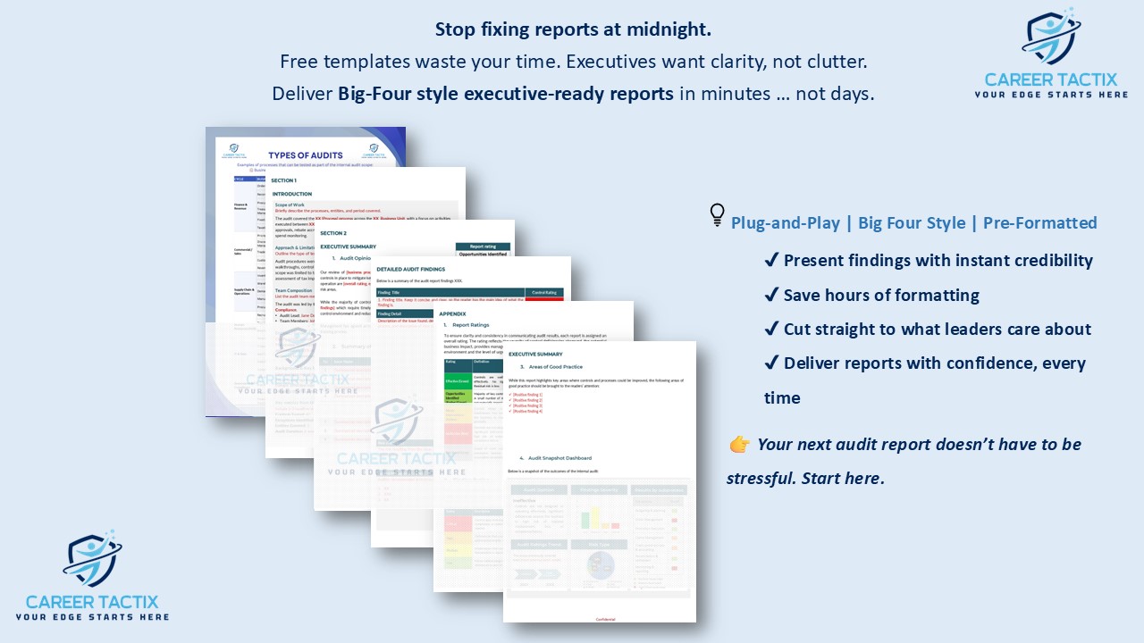 This plug-and-play Internal Audit Report Template Pack is pre-formatted in a Big Four–style layout, so you can simply add your content and produce executive-ready deliverables instantly.