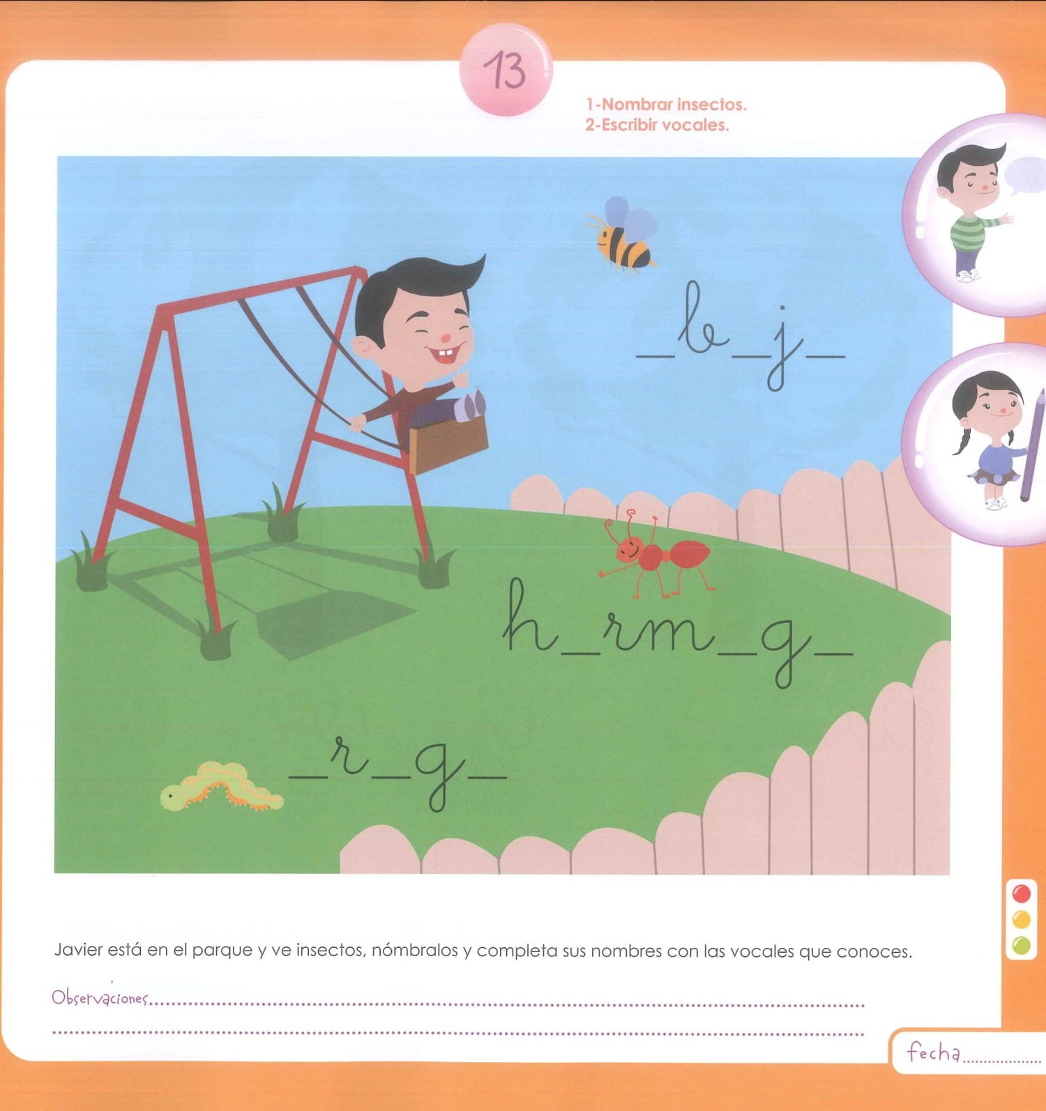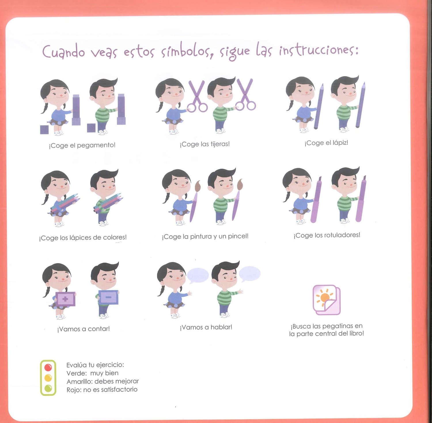 Los personajes Rocío y Javier acompañan al alumnado a lo largo de las páginas, motivando y guiando con un tono cercano y alegre.
