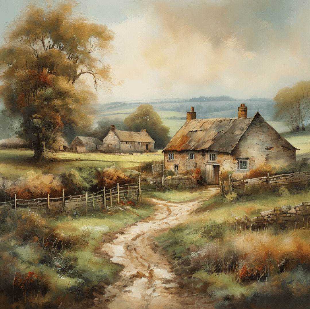 The old British countryside, a work of wall art dating back to 1960, with all its details and colours. The farm is an old oil painting in faded oil colours.png