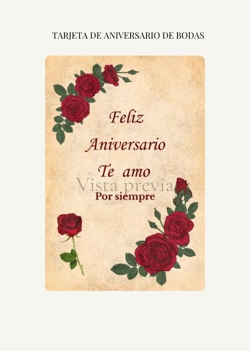 Una tarjeta con estilo vintage y textura cálida, decorada con rosas rojas y hojas verdes que enmarcan con elegancia un fondo beige suave. El diseño transmite romanticismo y compromiso, ideal para celebrar una unión que perdura. El mensaje central, “Feliz Aniversario. Te amo. Por siempre,” encapsula la promesa de amor duradero y la belleza de compartir la vida juntos.