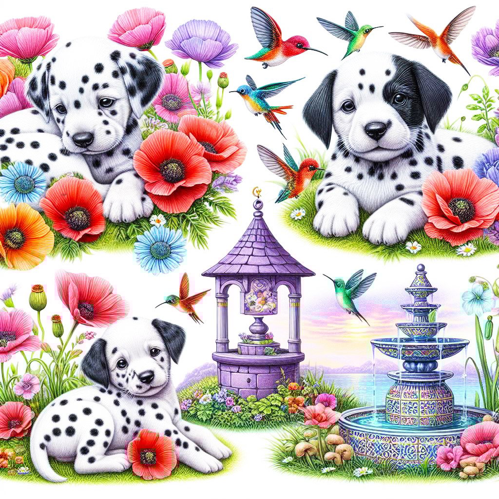 Dalmatian puppies snuggling together on a hill with poppies, daisies, & toadstools. There is a purple pond with a water fountain & a wishing well with patterned tiles. There are bright humming birds.